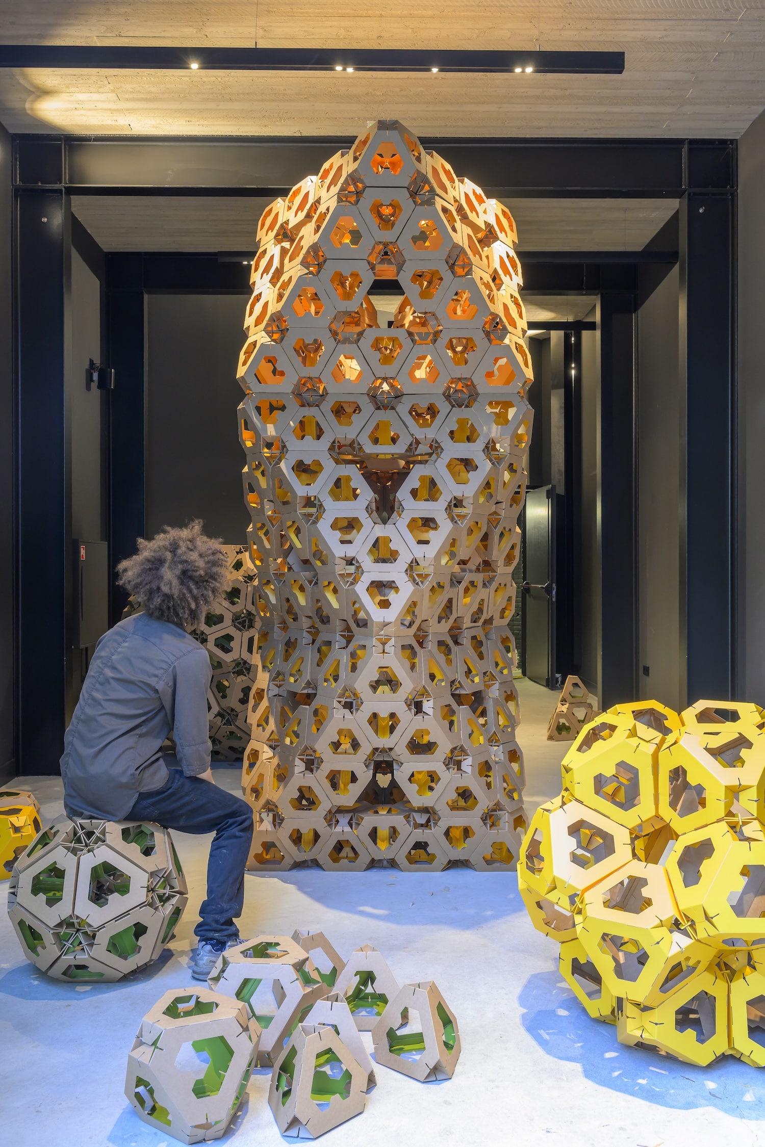 À travers des installations modulaires en carton recyclé, le studio transforme les espaces culturels en terrains de jeu collaboratifs, où chacun, petits comme plus grands, deviennent acteur de la création construisant l’oeuvre.