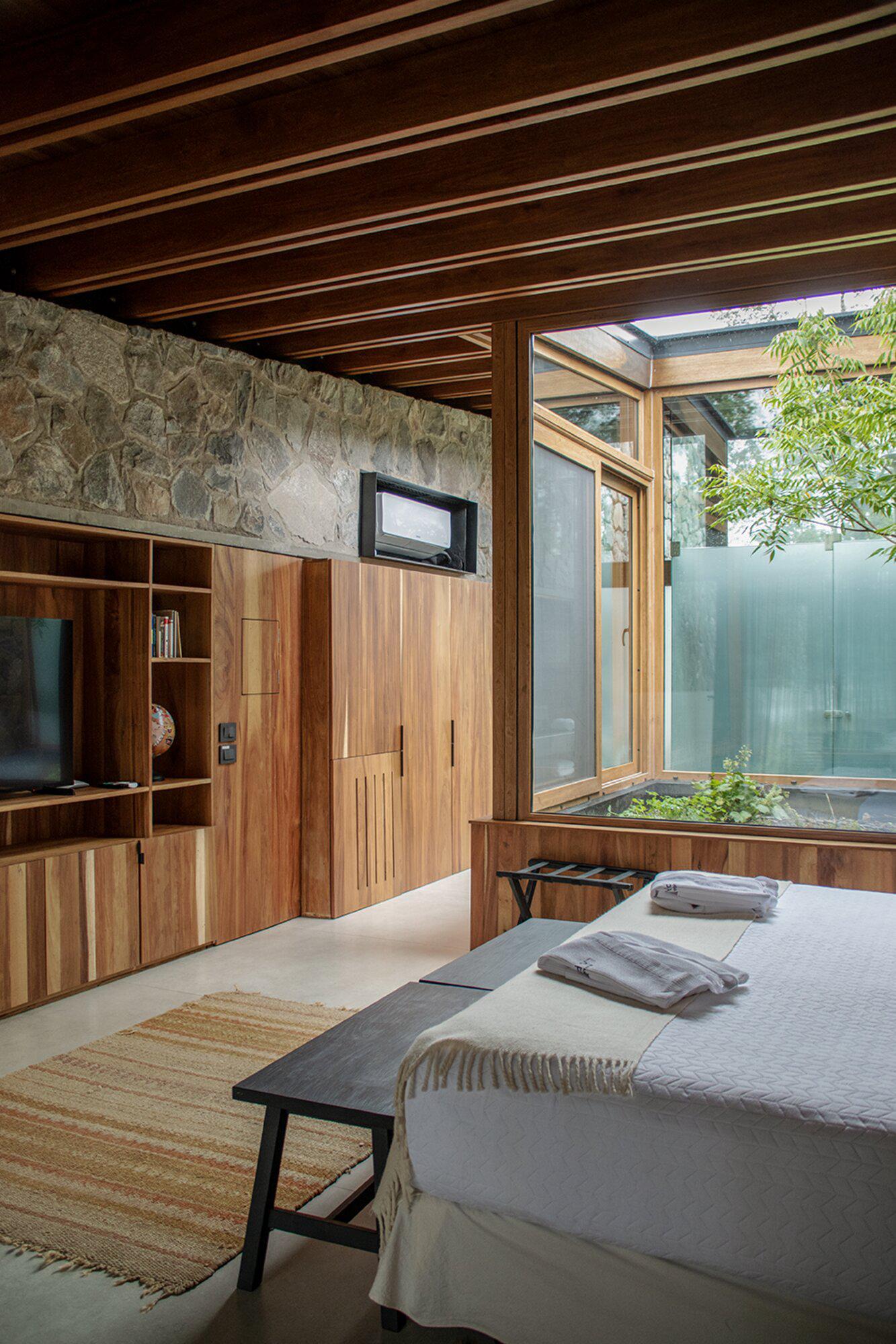 Les nouvelles suites, signées par le studio local Alarcia Ferrer Arquitectos, intègrent des références historiques et paysagères pour s’inscrire dans un projet cohérent avec leur époque et leur lieu. Le projet comprend sept larges murs de pierre parallèles, espacés de 5 mètres, qui soutiennent une toiture en bois inclinée vers des pièces génératrices d’eau. Ces murs et plafonds s’adaptent à la végétation et à la topographie naturelles jusqu’à trouver leur emplacement précis.
