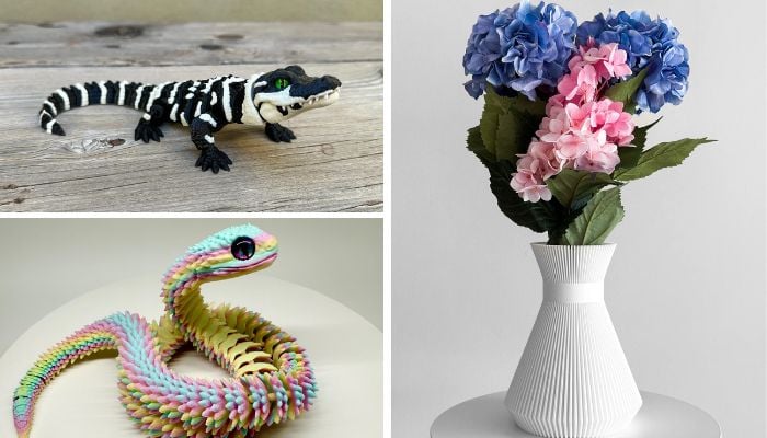 Produits d’impression 3D disponibles sur Etsy. (crédits photo : En haut à gauche : 3DSideShow. En bas à gauche : 3DPrintEngine. À droite : PotsAndPetalsDesign)