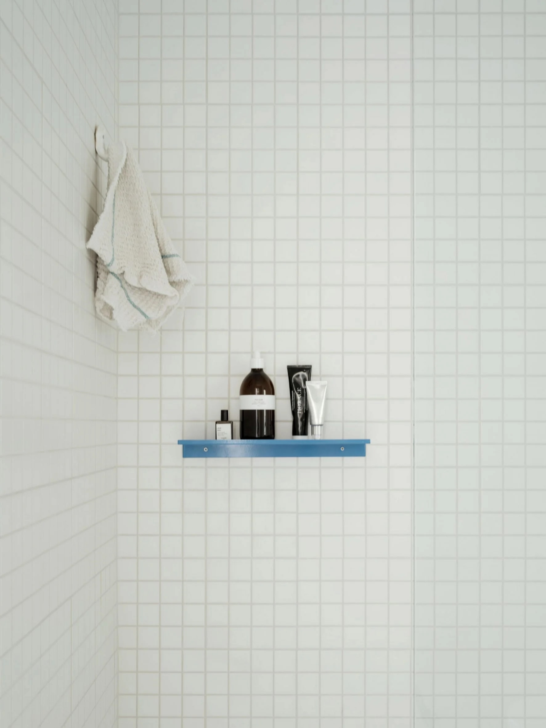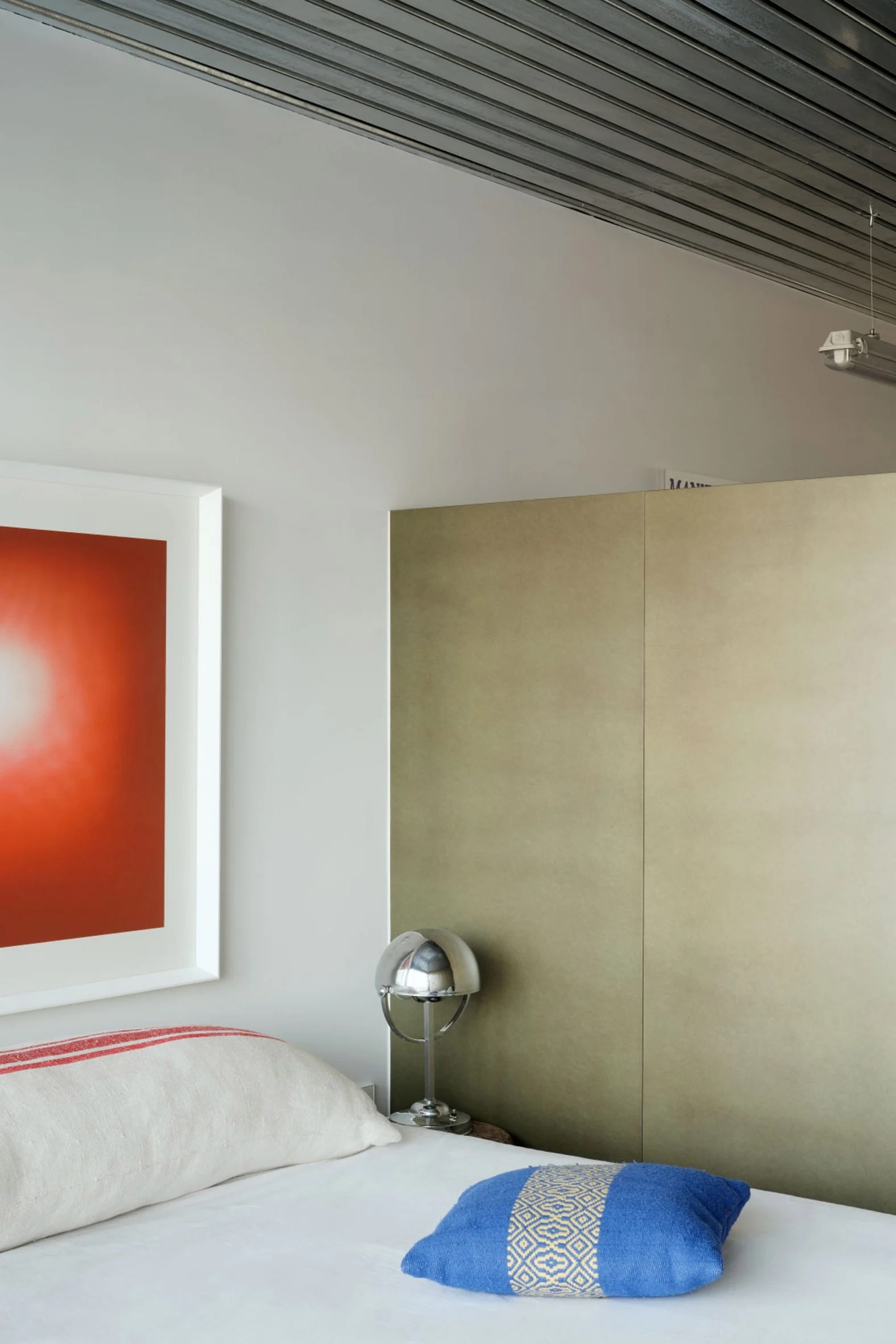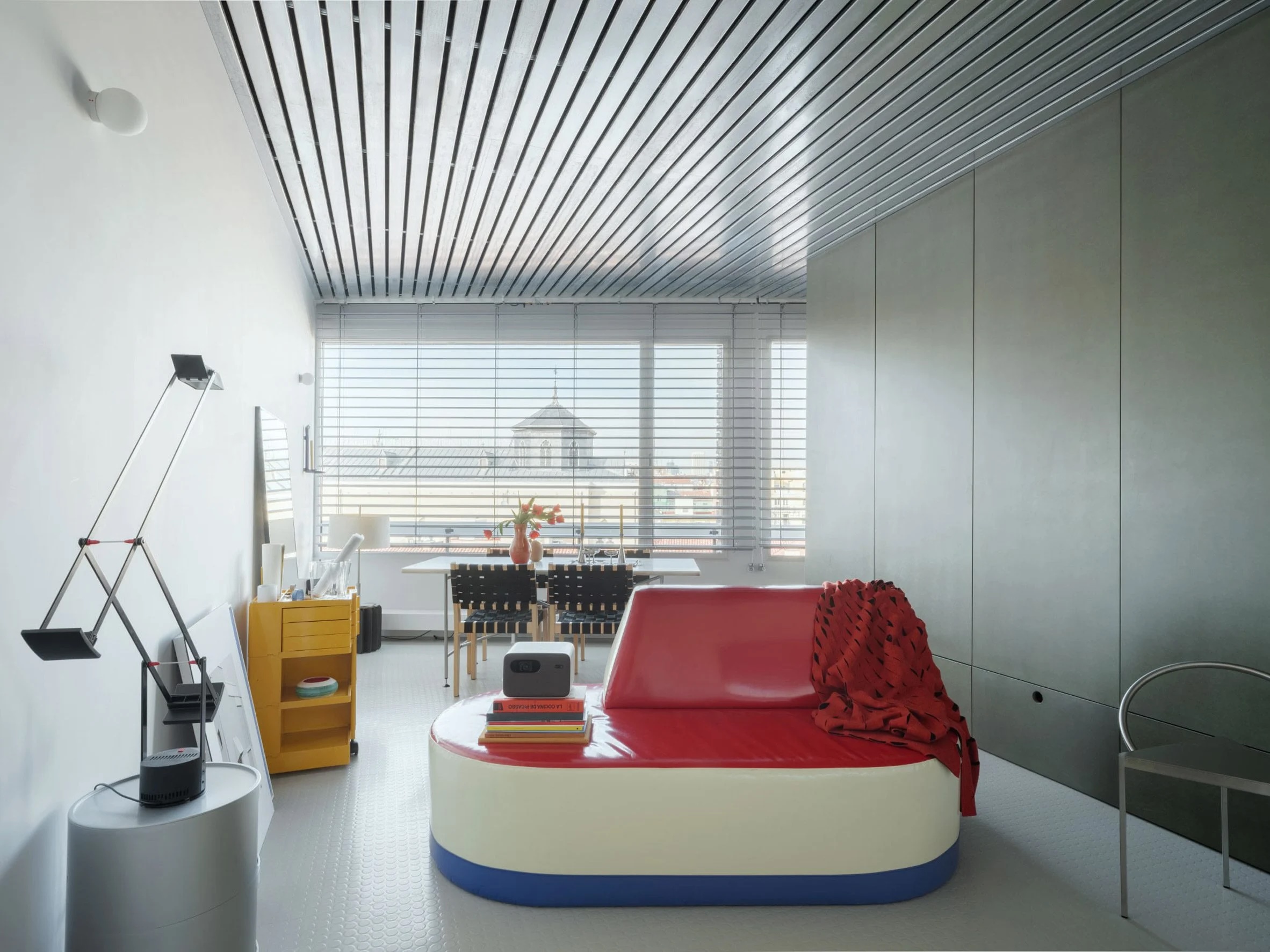 Le revêtement de sol en caoutchouc blanc, emblématique de la marque italienne de pneus Pirelli, a été associé à un plafond à lattes en acier galvanisé et à des stores uniformes, créant ainsi une toile de fond épurée dans toute la maison.