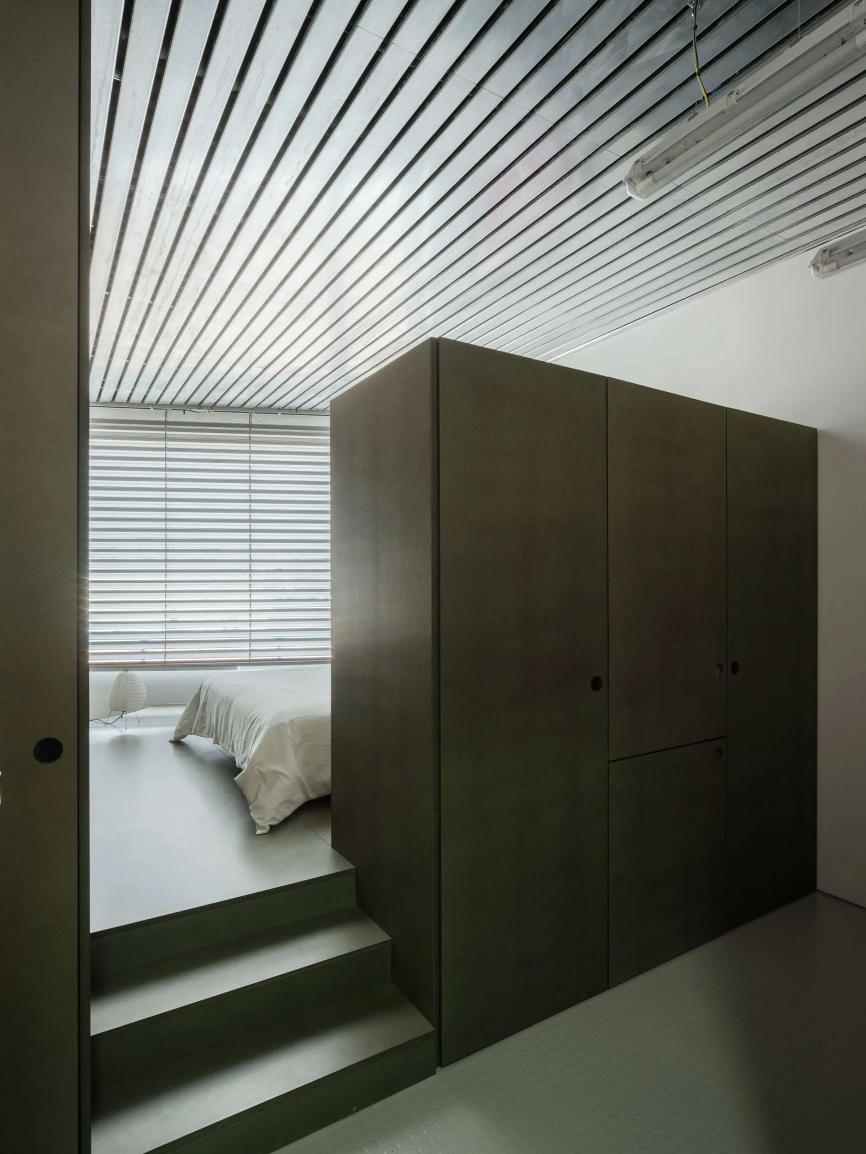 Au cœur de la rénovation se trouve la chambre, surélevée de trois marches par rapport au rez-de-chaussée et offrant une intimité optimale au sein de cet appartement par ailleurs ouvert. L’espace est dissimulé derrière deux armoires imposantes en MDF (panneaux de fibres de moyenne densité) brut vert sauge.