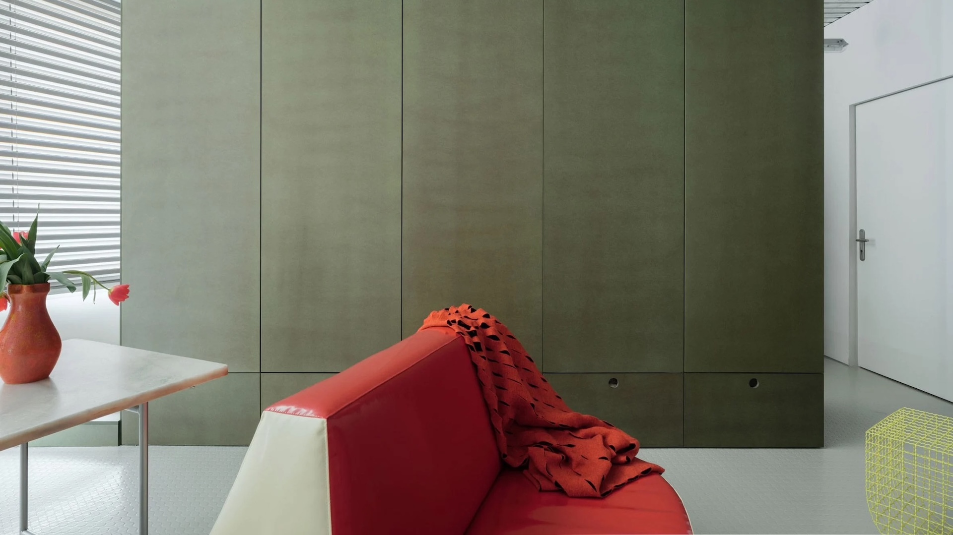 Un tabouret jaune grillagé, façon cage, et un canapé rouge brillant et arrondi font partie des touches de couleur ludiques qui contrastent avec le blanc éclatant des murs et du sol.