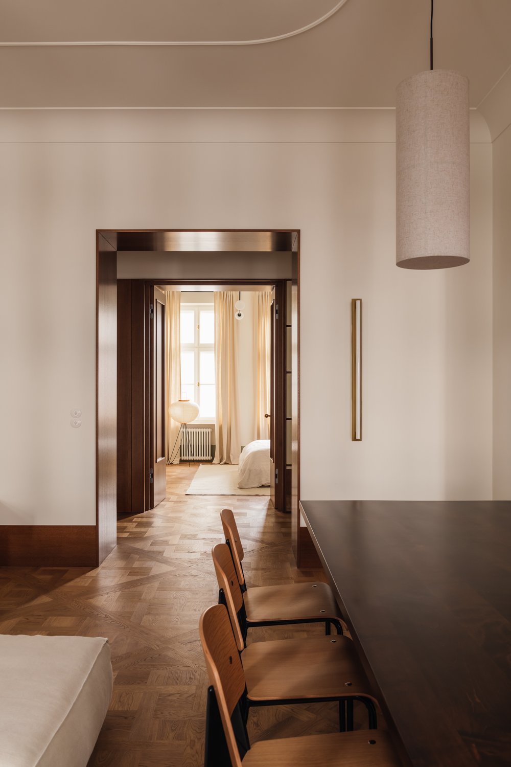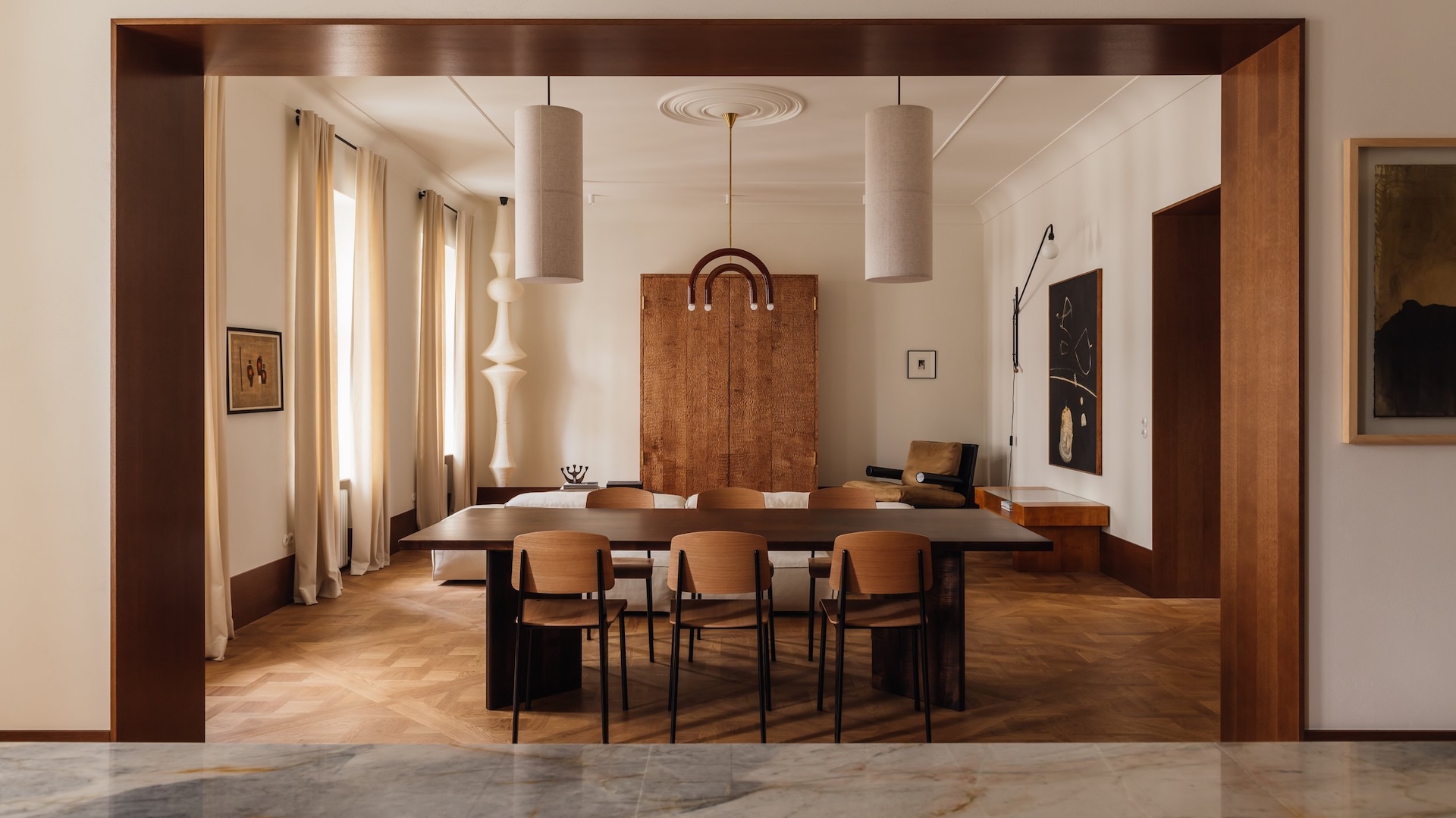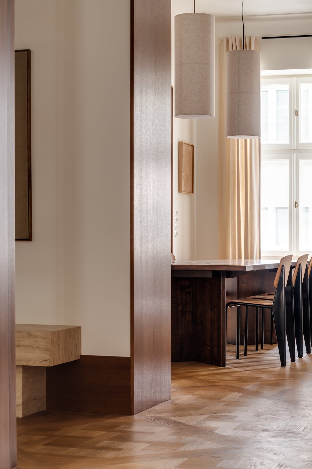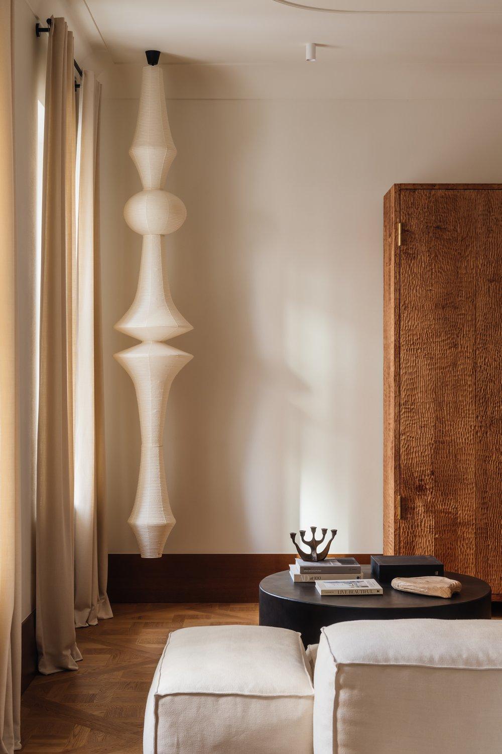 L’utilisation de matériaux comme le bois clair, la pierre, les tissus et le métal apporte une touche à la fois chaleureuse et industrielle, caractéristique du style de Melerska. Les grandes ouvertures laissent entrer la lumière naturelle, jouant avec les ombres et les reflets pour dynamiser l’espace sans surcharge visuelle.