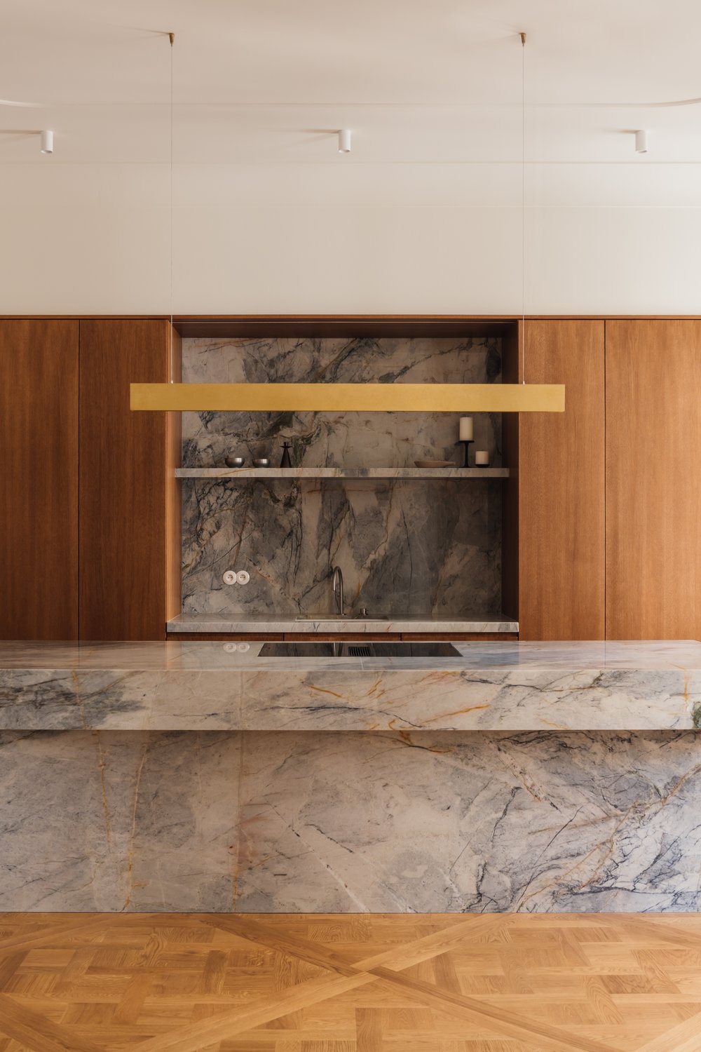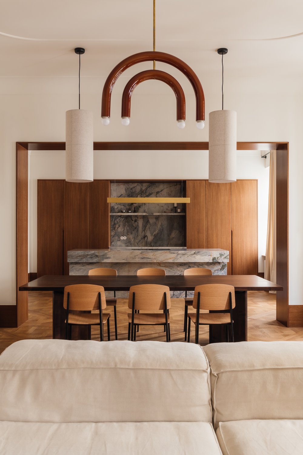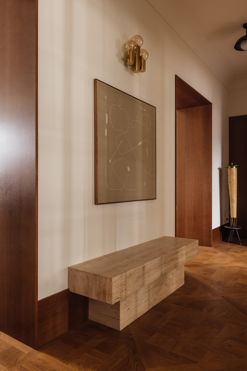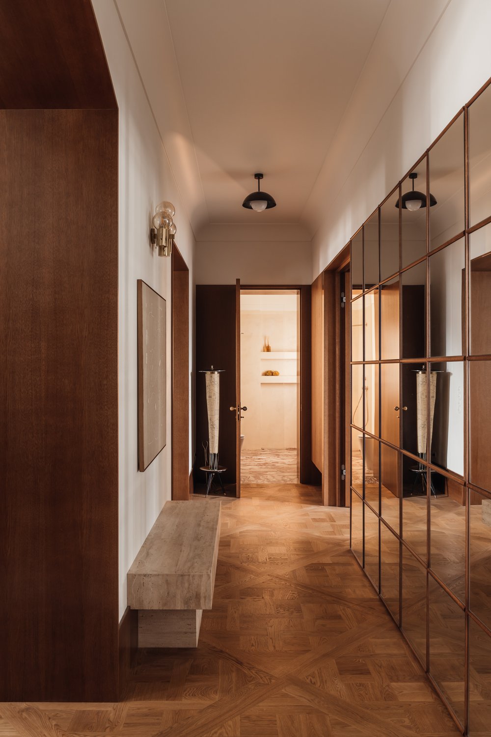 L’utilisation de matériaux comme le bois clair, la pierre, les tissus et le métal apporte une touche à la fois chaleureuse et industrielle, caractéristique du style de Melerska. Les grandes ouvertures laissent entrer la lumière naturelle, jouant avec les ombres et les reflets pour dynamiser l’espace sans surcharge visuelle.