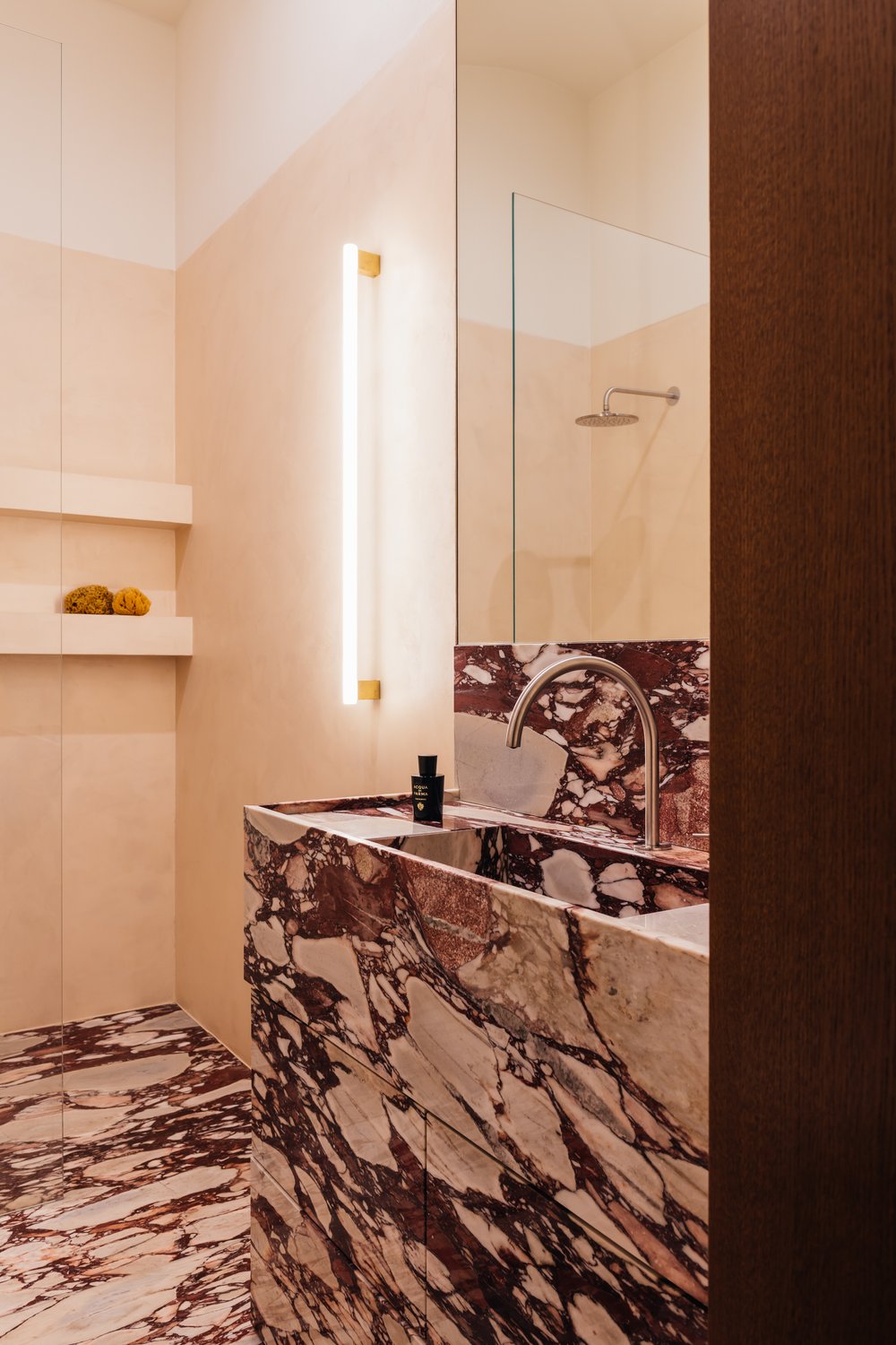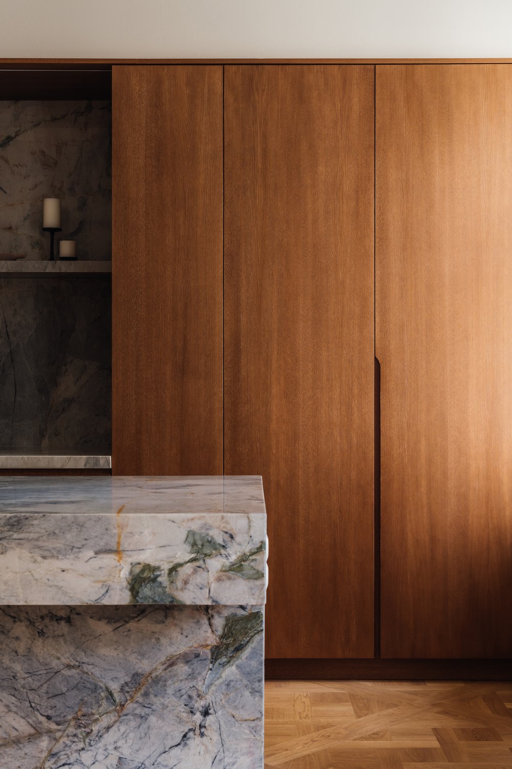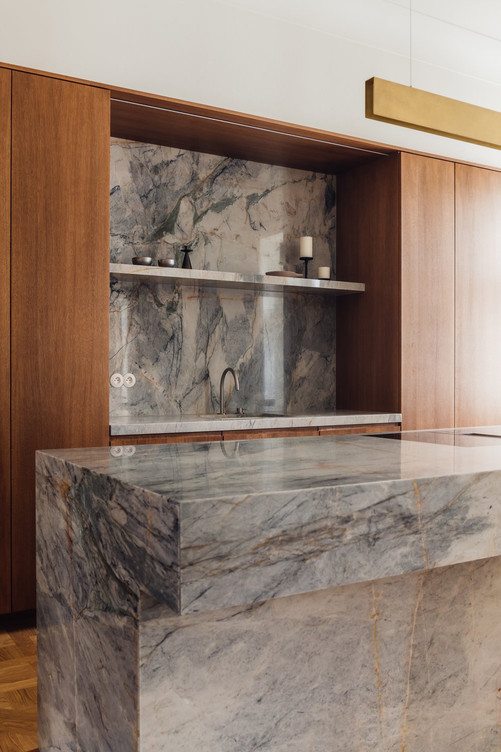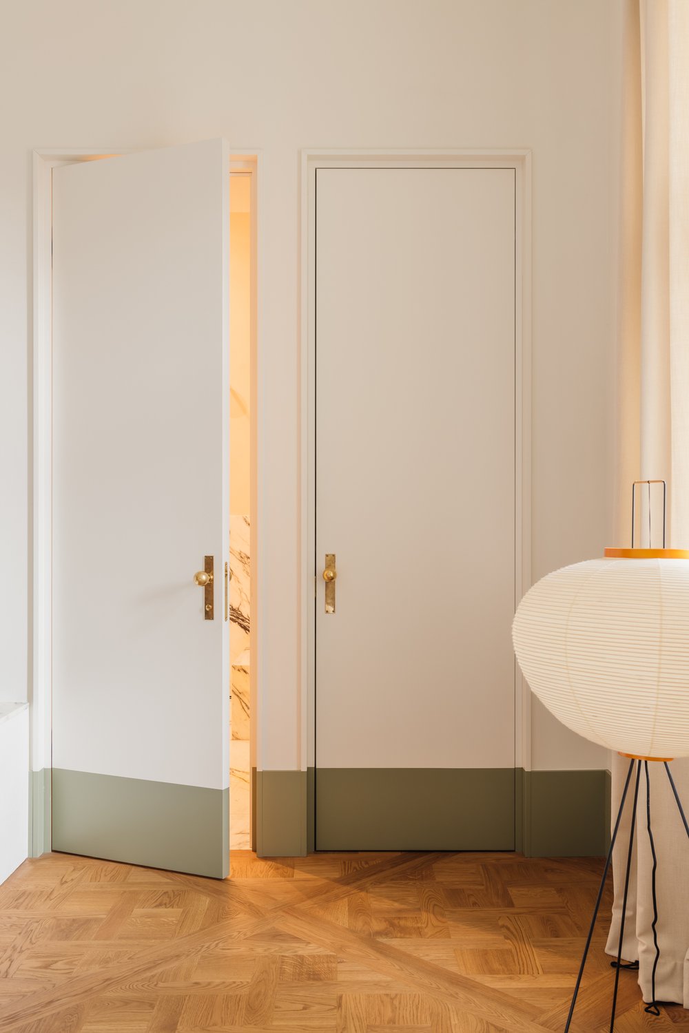 L’utilisation de matériaux comme le bois clair, la pierre, les tissus et le métal apporte une touche à la fois chaleureuse et industrielle, caractéristique du style de Melerska. Les grandes ouvertures laissent entrer la lumière naturelle, jouant avec les ombres et les reflets pour dynamiser l’espace sans surcharge visuelle.