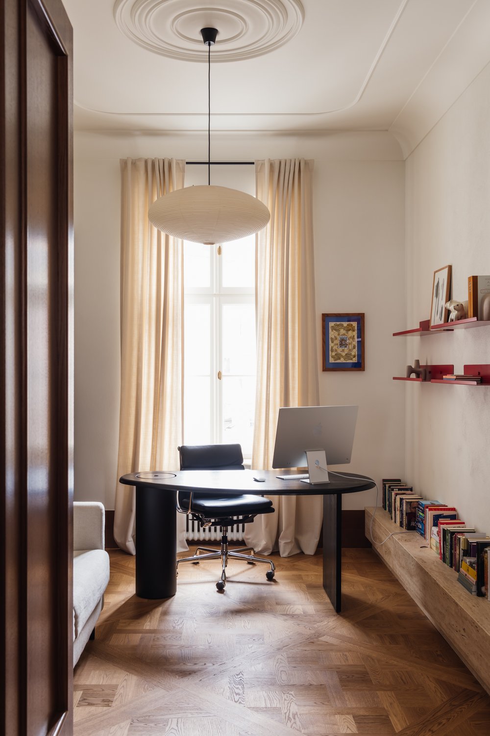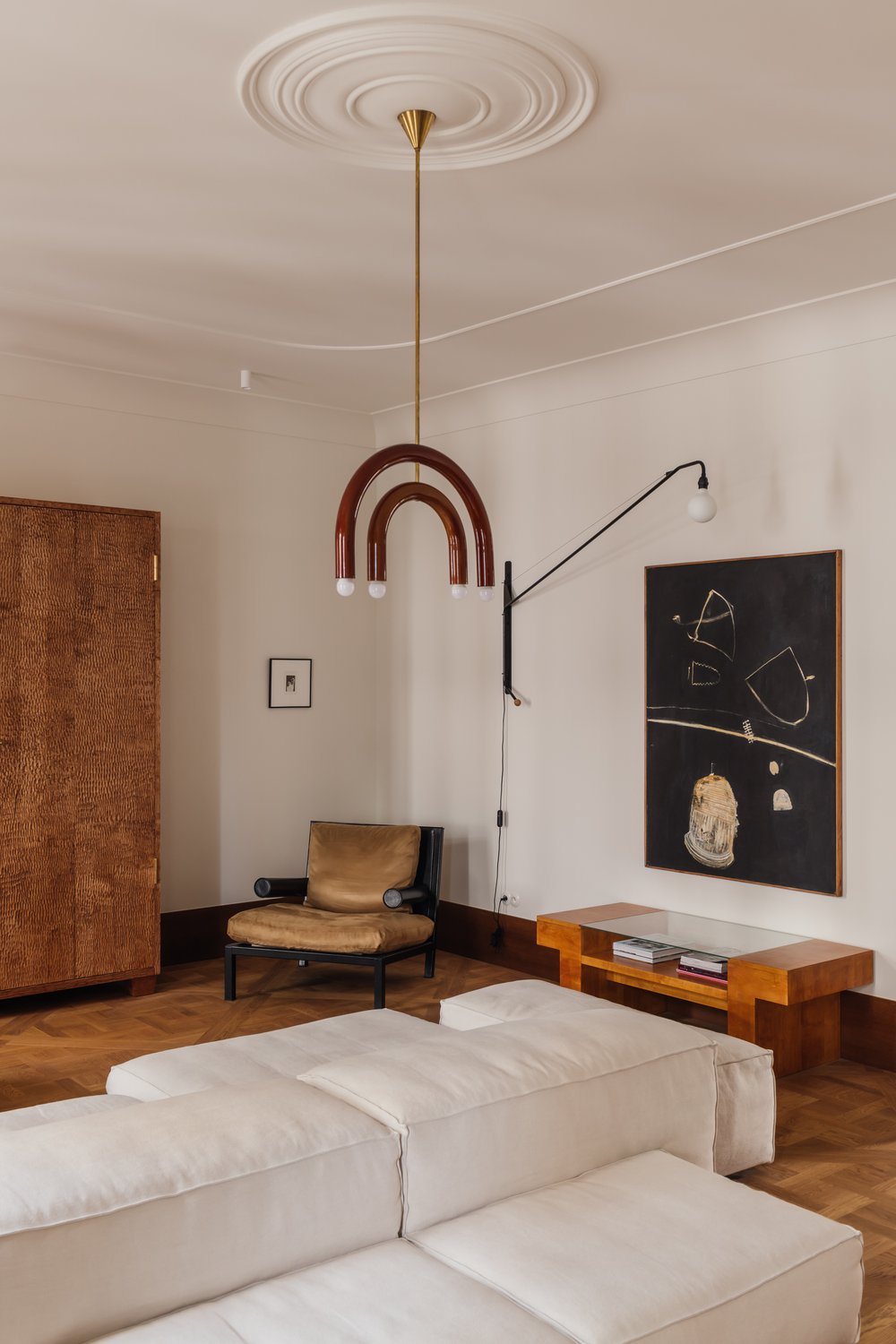 Dans un contexte urbain où les mètres carrés sont souvent limités, Agata Melerska a su optimiser chaque recoin de l’habitation. Les espaces de vie sont ouverts et fluides, favorisant une circulation naturelle. La cuisine, intégrée discrètement dans le salon, est à la fois fonctionnelle et esthétique, avec des rangements intégrés qui préservent la ligne épurée de l’ensemble.