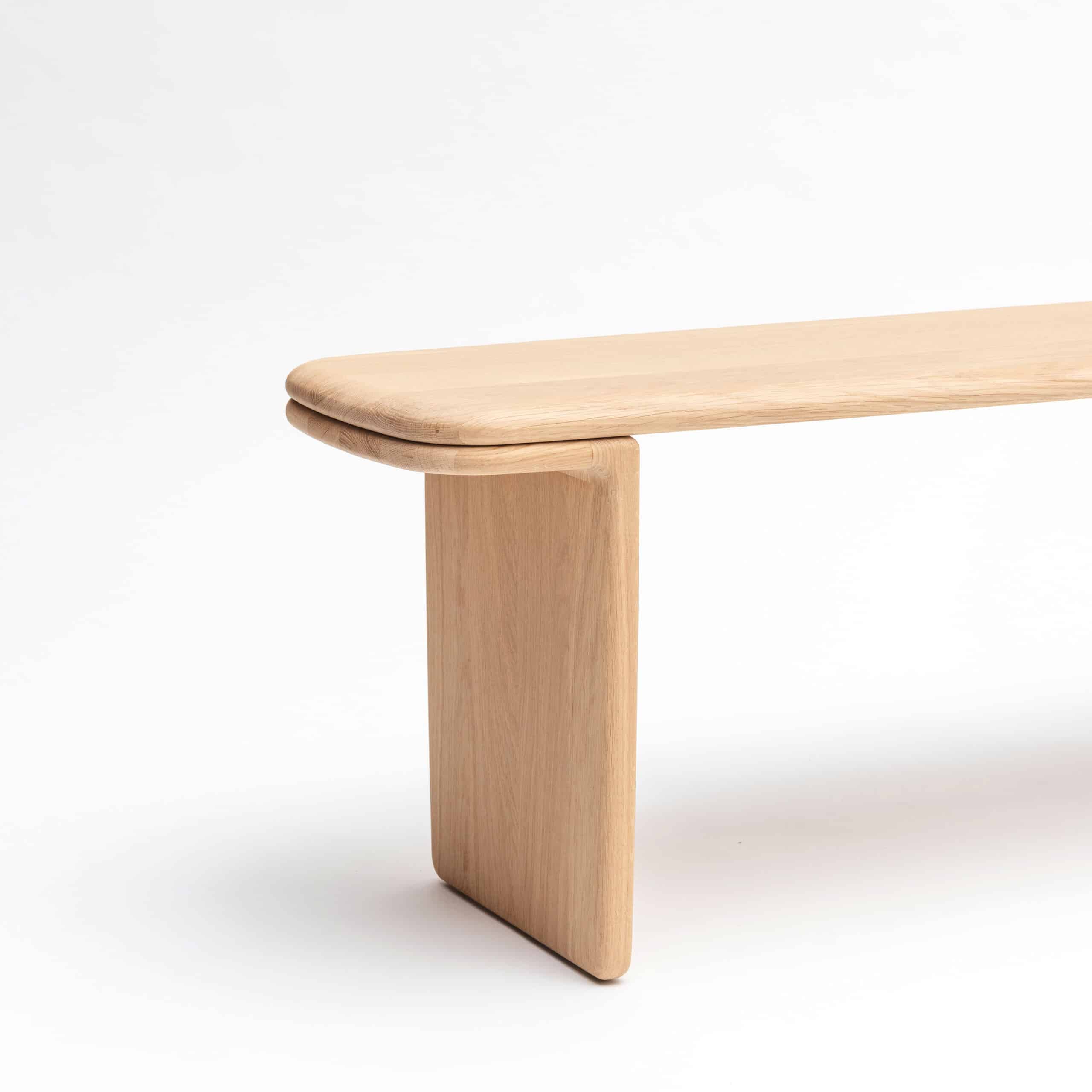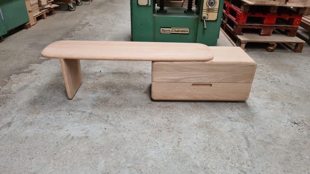 Le meuble TV Téhème, présenté en 2024, ajoute une dimension fonctionnelle plus affirmée. Il intègre un premier caisson fermé dans la collection, avec des poignées creusées et un plateau réversible, ajustable selon les besoins. Ce travail sur la modularité illustre l’intention du designer de concevoir des meubles adaptés à la diversité des intérieurs.