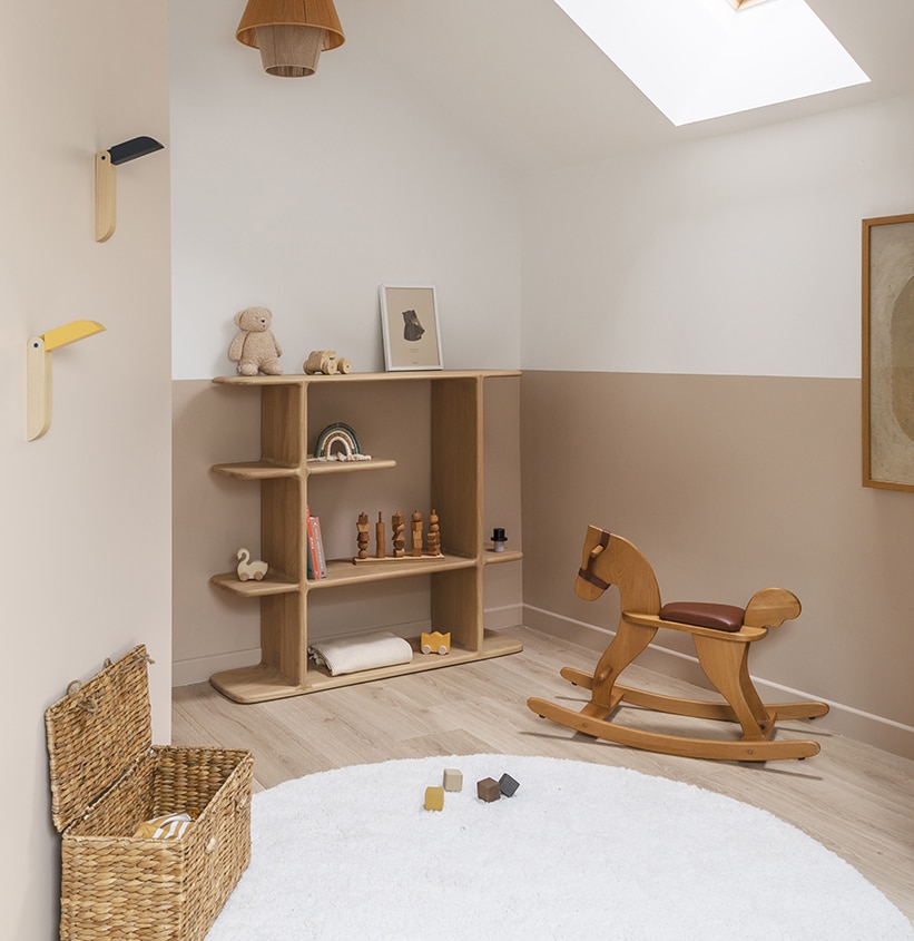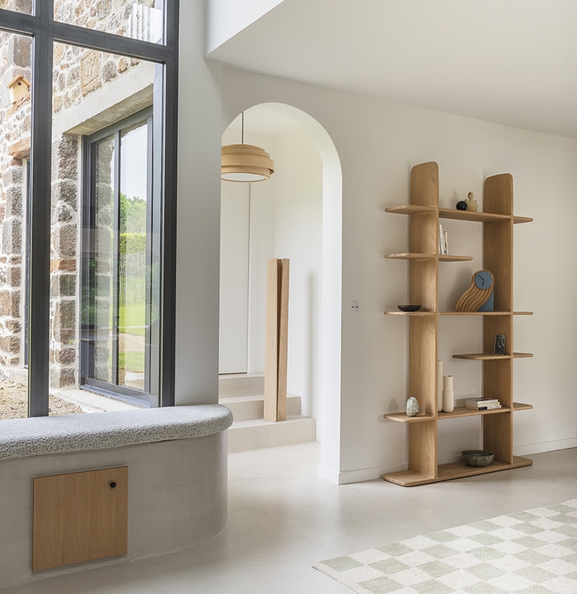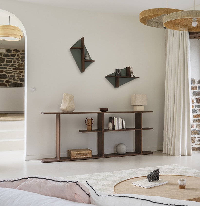 Pour accentuer la douceur de cette collection, des étagères murales viennent compléter l’offre. Inspirées de galets, elles offrent une lecture plus légère du mobilier mural, tout en conservant les lignes douces et arrondies caractéristiques du projet.