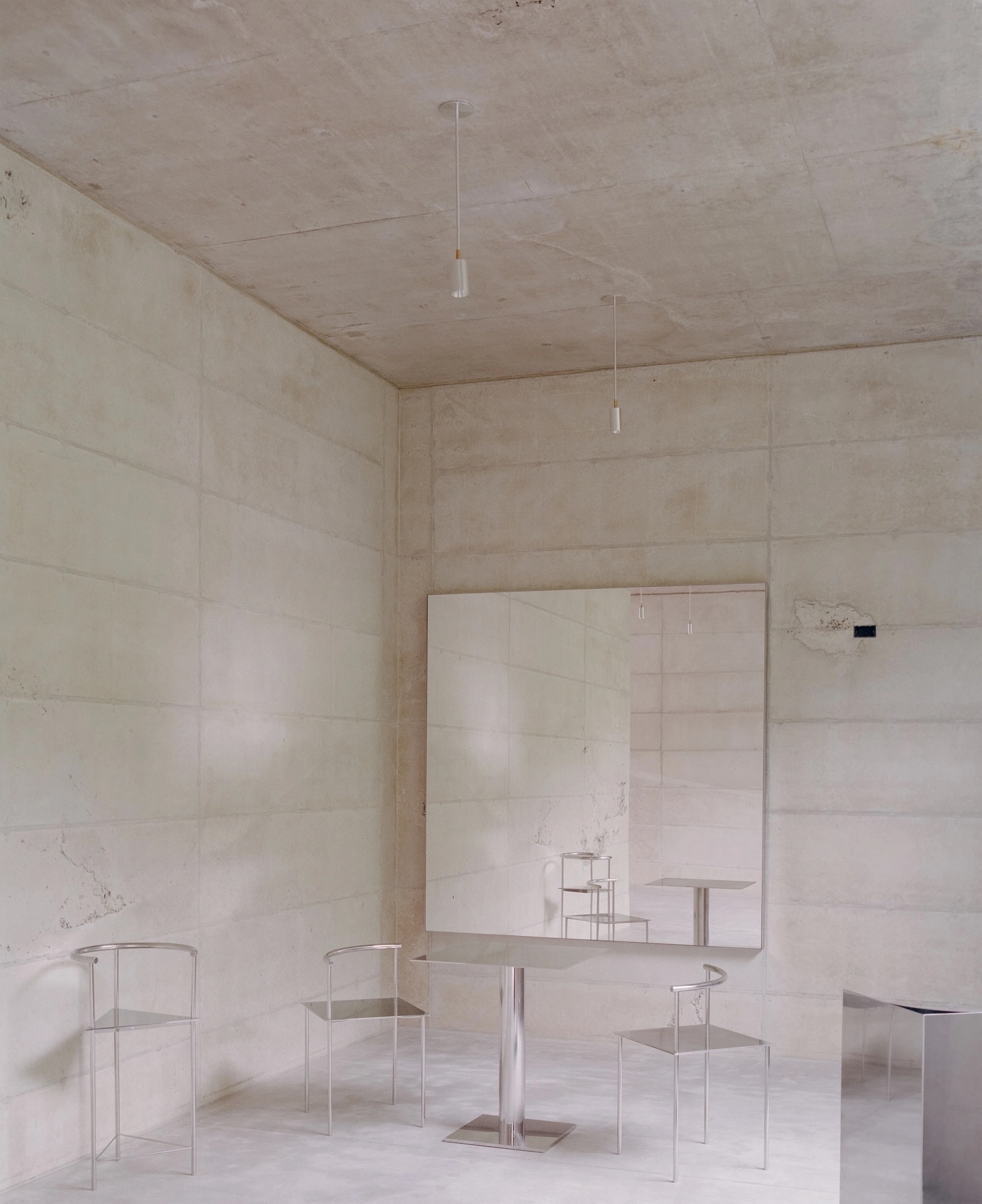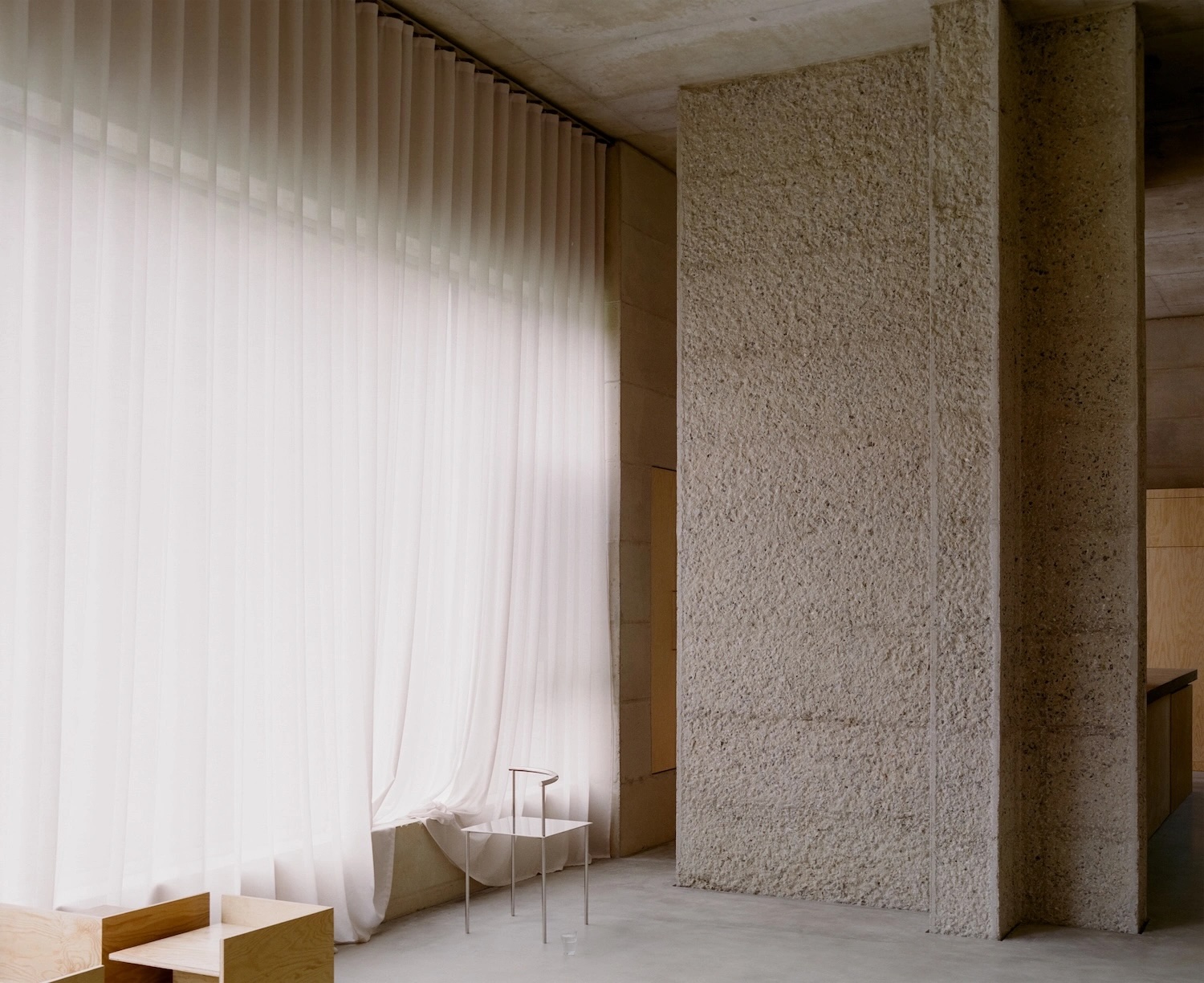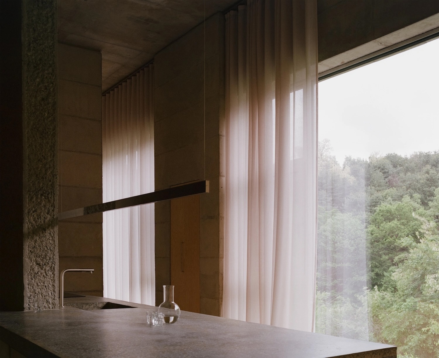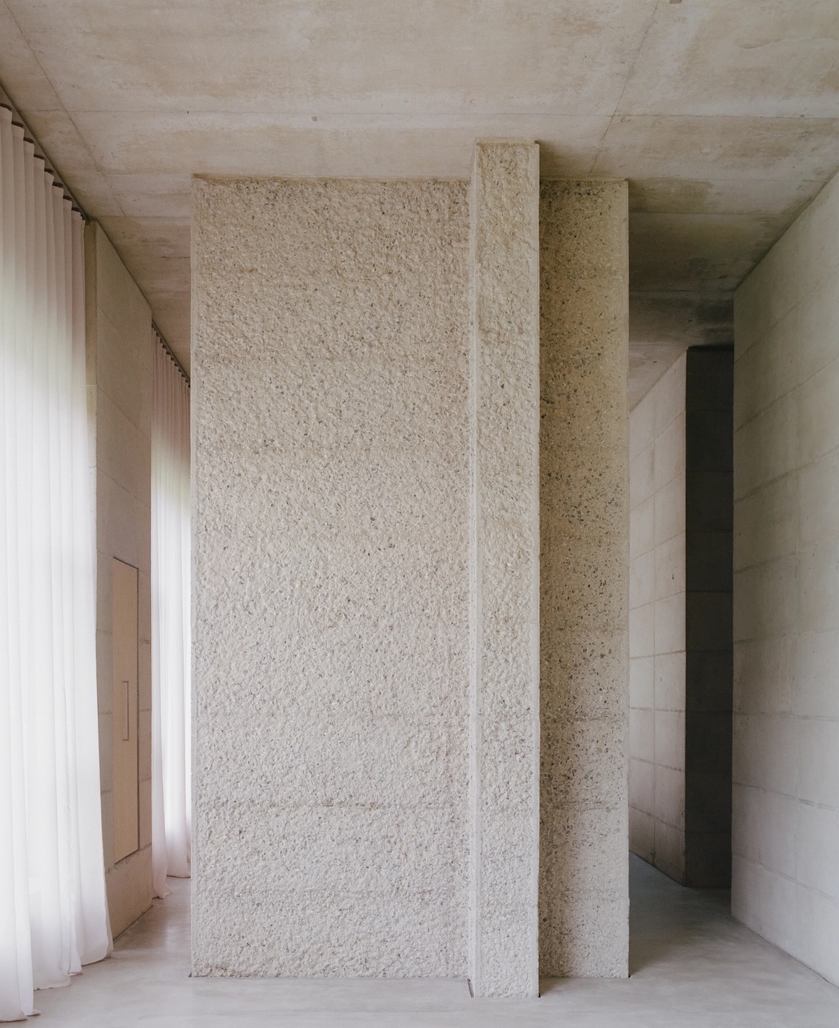 Sur le plan architectural, l’attention particulière portée aux matériaux est au cœur de son cadre conceptuel. Le béton, la pierre et le bois sont présentés avec simplicité, sans aucun ornement, permettant à leurs qualités intrinsèques de communiquer directement.