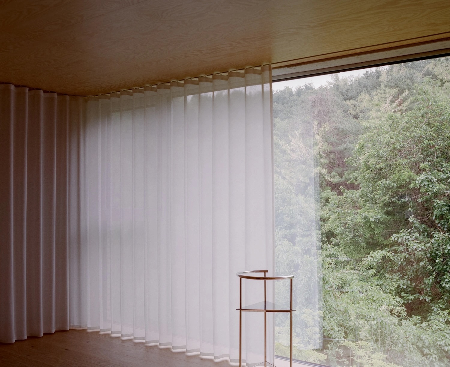L’équilibre entre ouverture et isolement de la maison s’exprime dans le contraste des façades : largement ouvertes sur la colline boisée au sud, mais discrètement réservées sur la rue au nord, préservant une tension délibérée qui encadre à la fois la nature et la vie urbaine.