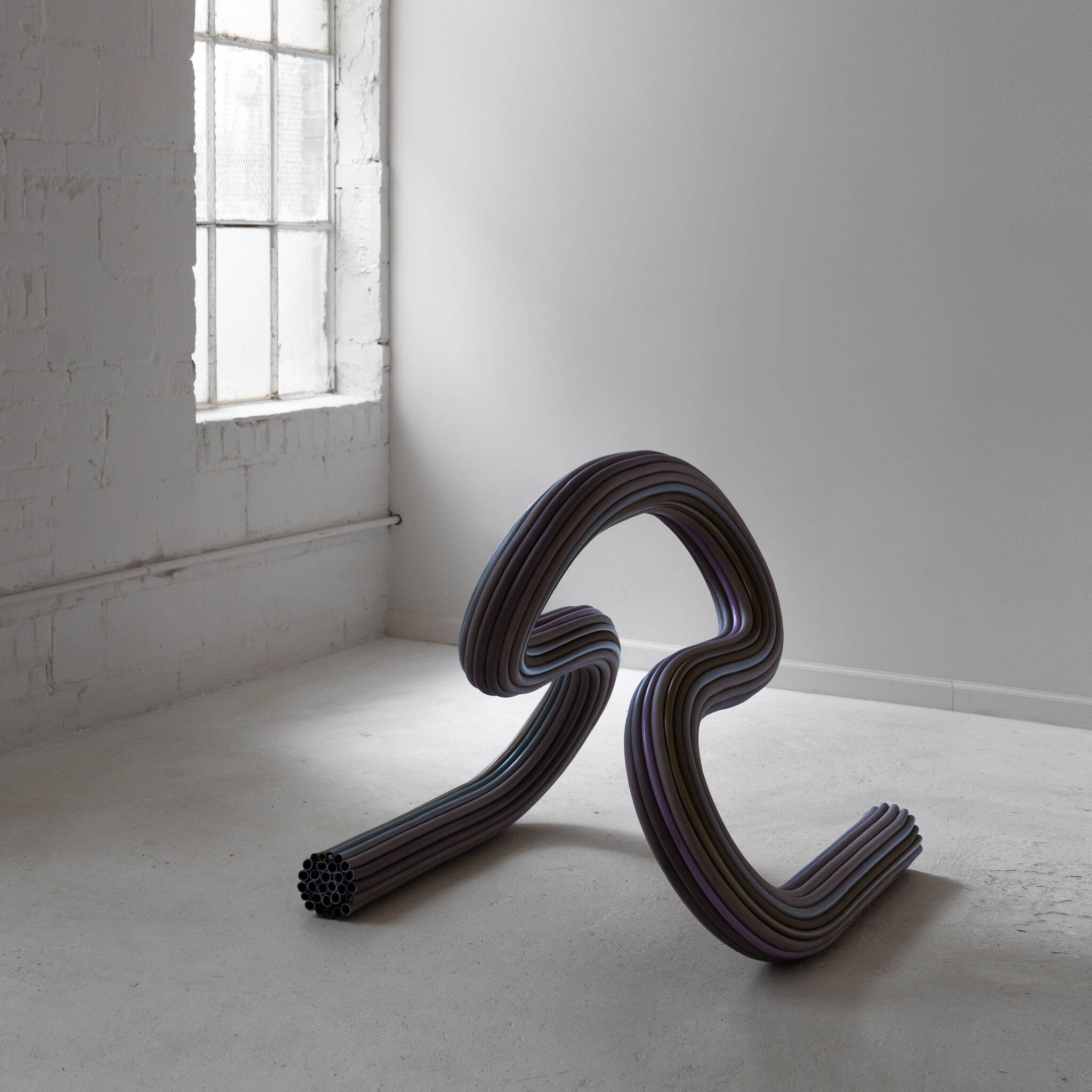 La série d’Ara Thorose, qui comprend un escabeau, une échelle sur pied et une chaise longue, est inspirée d’une échelle inclinée. Chaque œuvre se situe à la frontière de la sculpture et de l’objet fonctionnel, tout en présentant une forme minimaliste et fluide.
