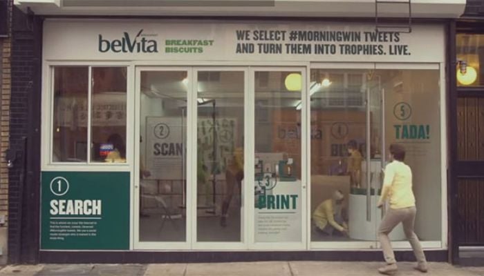 La marque de biscuits pour le petit-déjeuner belVita a lancé en 2014 une campagne publicitaire intéressante aux États-Unis intitulée « #MorningWin – Énergie constante, toute la matinée ». L’idée de belVita était de mettre en avant les propriétés énergétiques de ses biscuits en récompensant les consommateurs pour leurs « matinées gagnantes ». Pour ce faire, ils ont organisé un concours et demandé aux abonnés de leur compte Twitter de partager leur meilleur succès matinal. Les scénettes les plus amusantes ont ensuite été sélectionnées et transformées en véritables trophées imprimés en 3D. L’entreprise a même loué une boutique à New York pour exposer ces trophées. Il s’agissait de la première campagne marketing combinant l’écoute des réseaux sociaux et la technologie d’impression 3D.