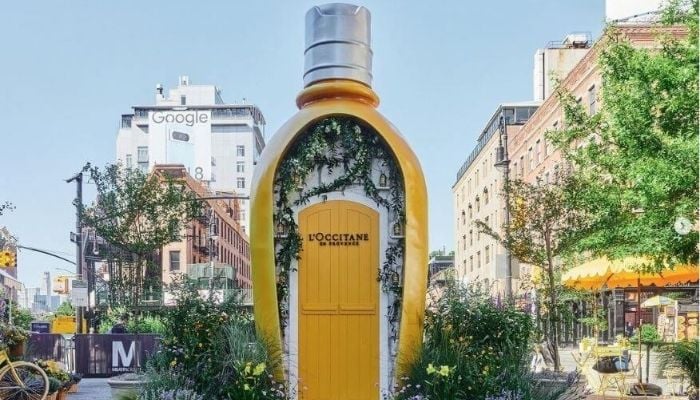 Un autre exemple de la manière dont la publicité adopte de nouveaux outils dans ses campagnes est donné par la marque française L’Occitane en Provence. En 2024, elle a installé une réplique de 4,2 mètres de haut de son emblématique huile de douche à l’amande à Chelsea pour célébrer les 20 ans du produit. Le studio de design Pink Sparrow, connu pour avoir collaboré avec de nombreuses marques, s’est chargé de la conception et de la fabrication. Pour cela, ils ont utilisé la technologie d’impression par dépôt de gel (GDP) de MASSIVIT, en particulier l’imprimante Massivit 5000, une machine conçue pour produire des pièces grand format sans besoin de supports.