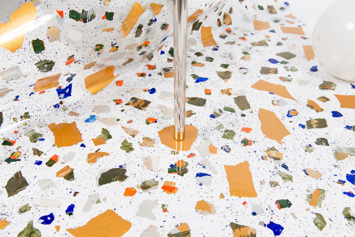 La fabrication de l’Artyl repose sur une double couche de vinyle : le partenaire du studio, coule une première plaque, sur laquelle il applique minutieusement à la main les fragments de motifs, des éclats de peinture sélectionnés et disposés un à un. Une fois cette phase terminée, une seconde plaque est coulée par-dessus pour figer l’ensemble, tel un sandwich. Ce processus long et minutieux rend chaque pièce unique.