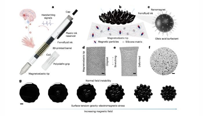 Lorsque l’utilisateur écrit avec le stylo, la pression déforme la pointe du stylo, ce qui entraîne un déplacement du flux magnétique par effet magnétoélastique (l’effet magnétoélastique désigne la modification des propriétés magnétiques d’un matériau sous l’effet d’une contrainte). La variation du flux magnétique, combinée au mouvement de l’encre ferrofluide pendant l’écriture, génère des signaux de tension dans le ressort du stylo. L’idée est que lorsqu’une personne atteinte de Parkinson écrit avec le stylo, les signaux de tension affichent des anomalies qui ne sont pas présentes dans l’écriture normale, c’est-à-dire des tremblements de la main qui se traduisent par des pics mineurs supplémentaires. En d’autres termes, l’écriture est convertie en signal électrique pour quantifier les irrégularités de l’écriture.