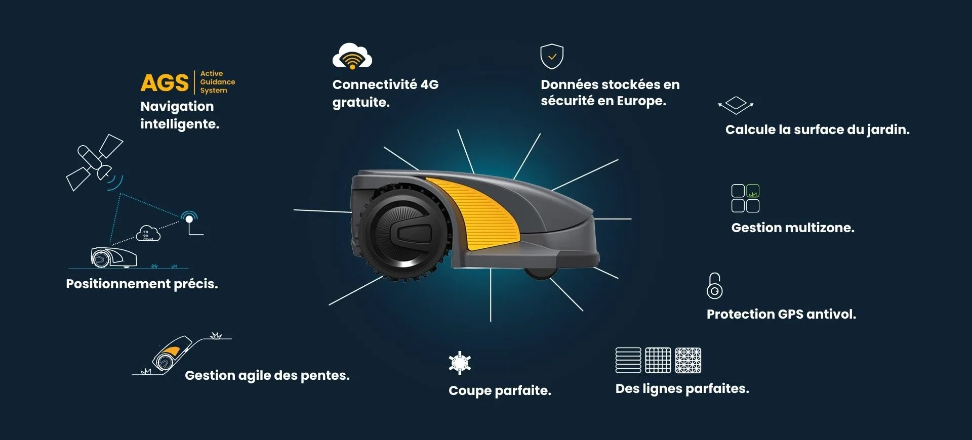 – Un algorithme de navigation optimisé : réduisant le temps de tonte et prolongeant la durée de vie de la batterie.