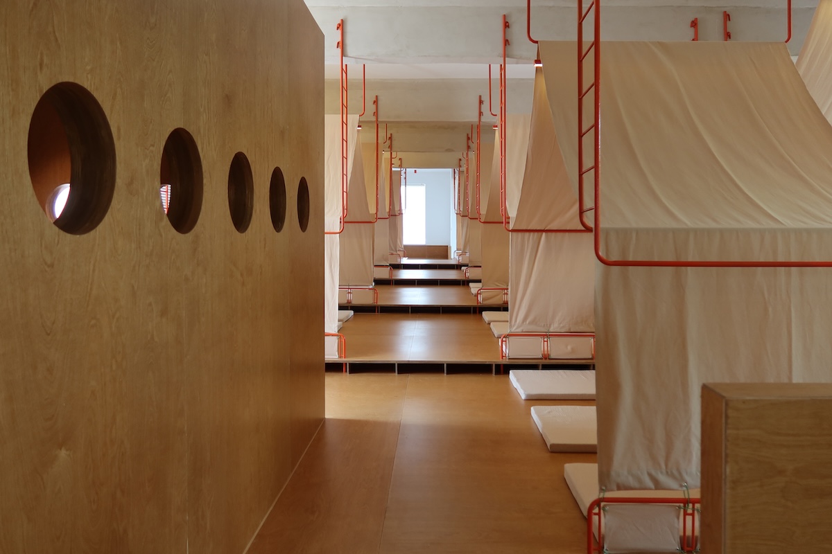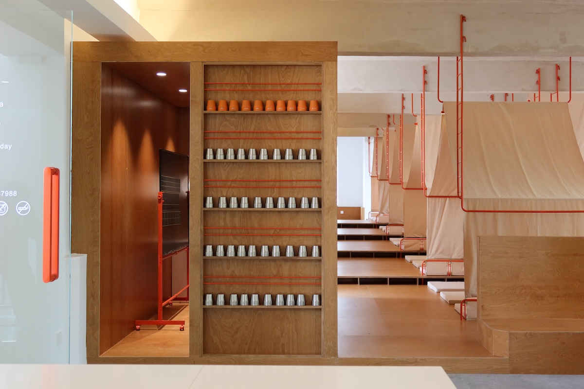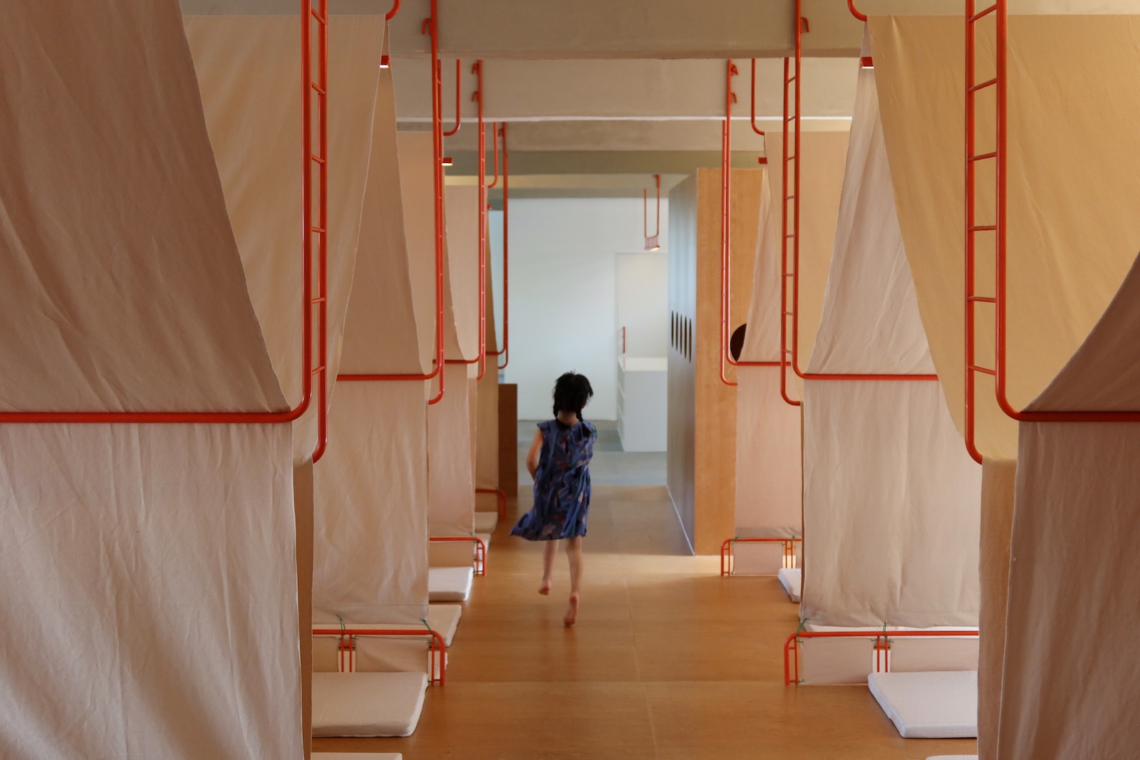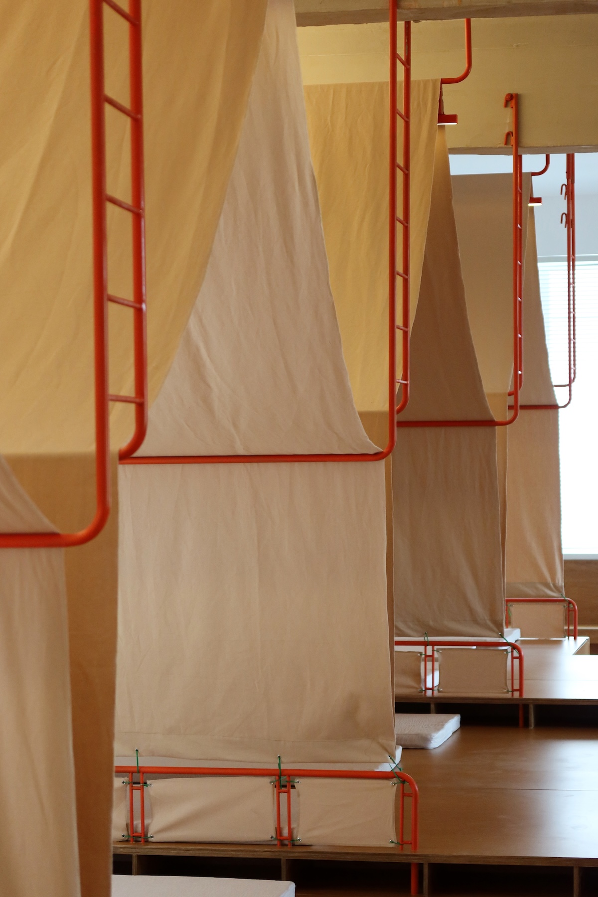 Pour les designers, la tente symbolise non seulement un abri, mais aussi la liberté, l’exploration et l’amusement. Les tentes disponibles sur le marché étaient soit inadaptées, soit inefficaces en termes d’utilisation de l’espace, alors l’équipe a développé un système de tentes sur mesure – composé de cadres métalliques orange, de toile beige, d’un éclairage intégré et de plateformes en bois – formant ainsi des espaces multi-fonctionnels intimes pour la lecture et le repos.