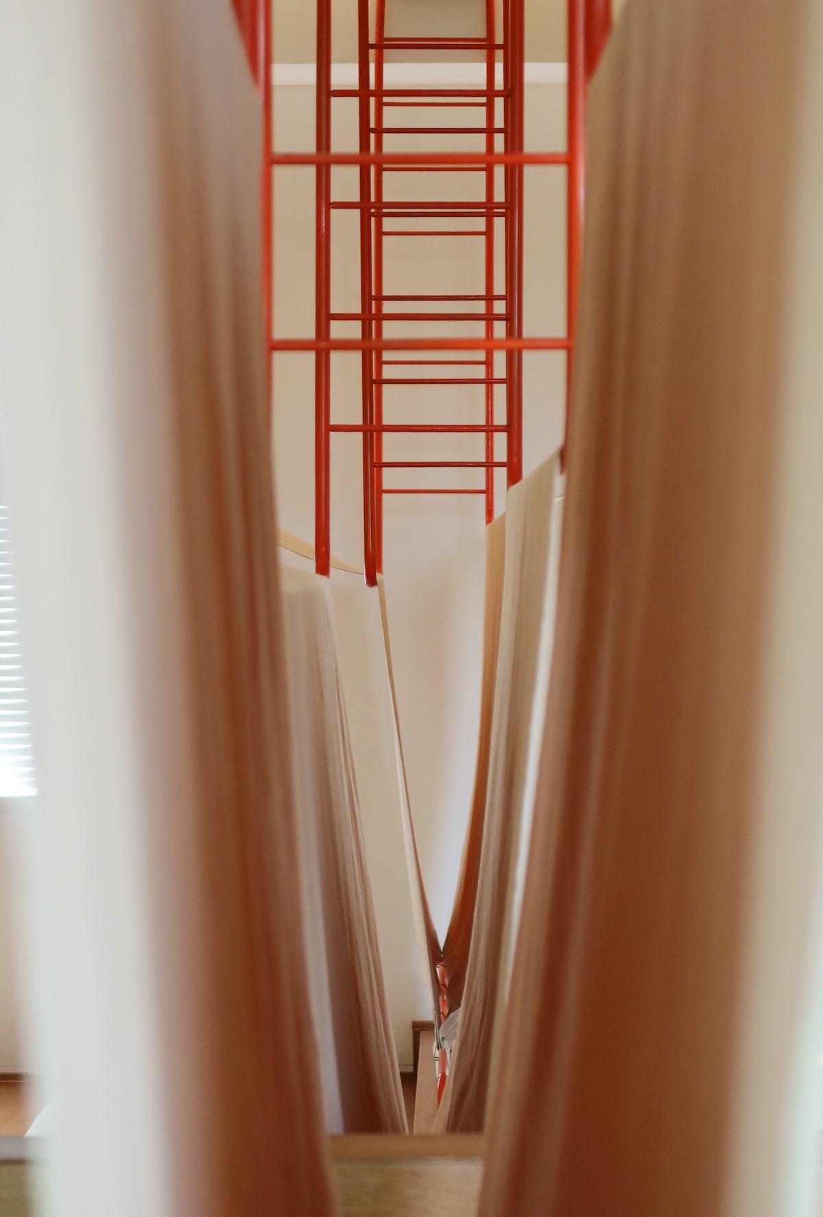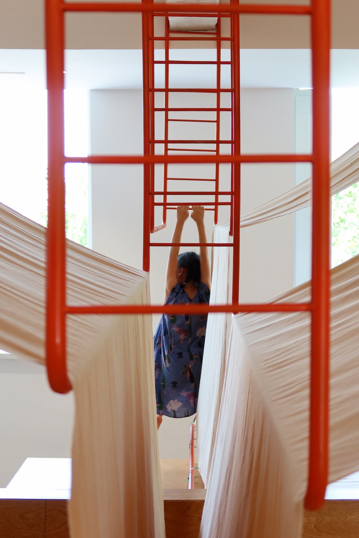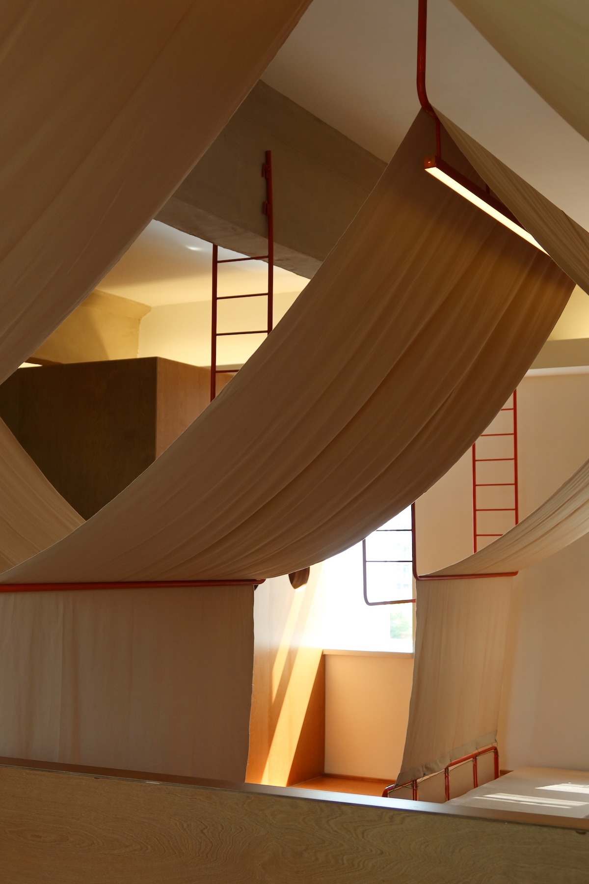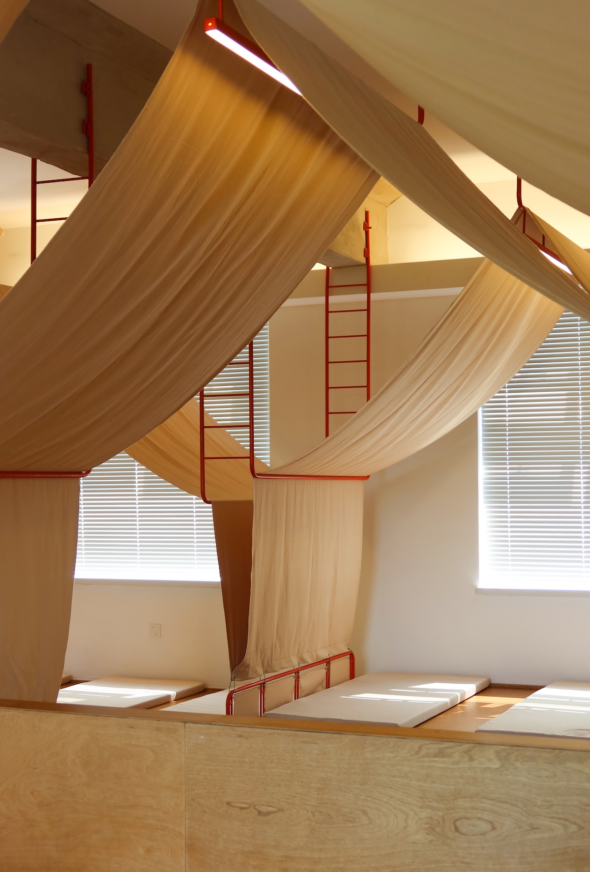 Pour les designers, la tente symbolise non seulement un abri, mais aussi la liberté, l’exploration et l’amusement. Les tentes disponibles sur le marché étaient soit inadaptées, soit inefficaces en termes d’utilisation de l’espace, alors l’équipe a développé un système de tentes sur mesure – composé de cadres métalliques orange, de toile beige, d’un éclairage intégré et de plateformes en bois – formant ainsi des espaces multi-fonctionnels intimes pour la lecture et le repos.