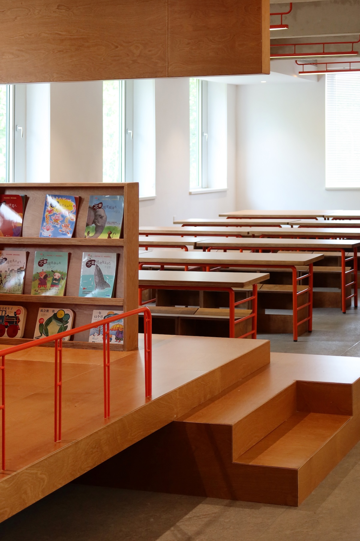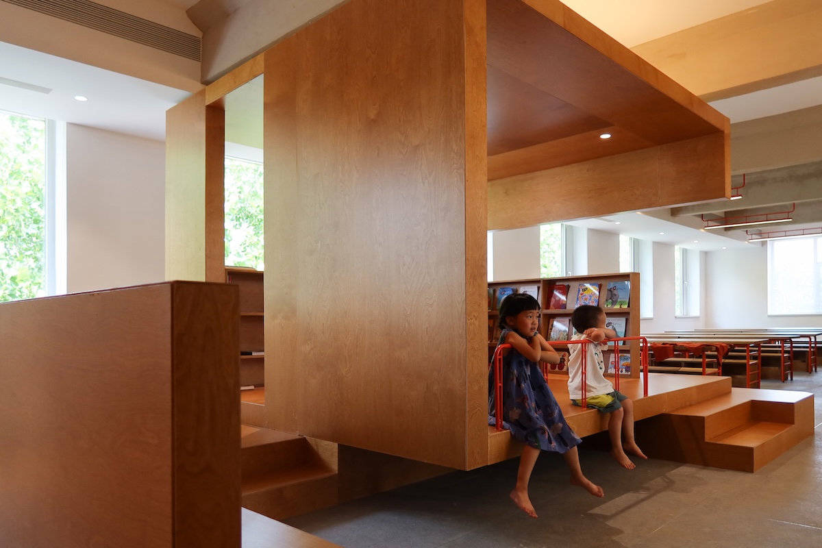 Le bureau des enseignants et la réception se trouvent près de l’entrée, avec des ouvertures circulaires pour une surveillance facile. Une boîte en bois centrale sert à la fois de cloison et de coin lecture confortable pour les parents en attente. La cuisine et les toilettes sont dissimulées dans des zones sans fenêtres, maximisant ainsi l’efficacité de la circulation.