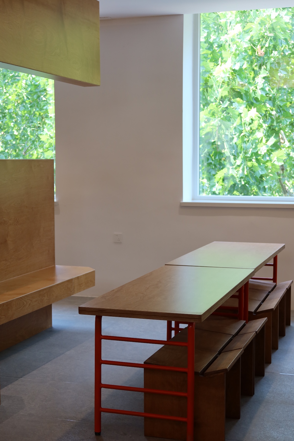 Situé au troisième étage d’un immeuble, l’espace donne sur une rue bordée d’arbres. La lumière naturelle et la verdure filtrent à travers les fenêtres orientées à l’ouest. Des stores et une ventilation minimale ont été ajoutés uniquement là où c’était nécessaire, préservant ainsi la beauté brute des environs.