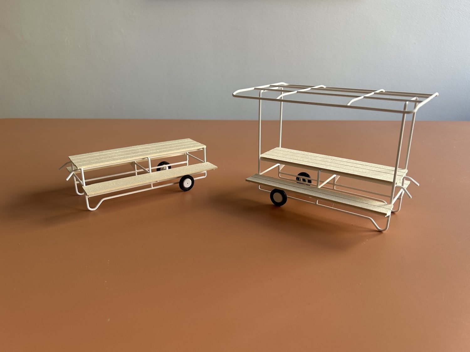 Il imagine alors une table facilement déplaçable, capable de s’adapter à différents usages. Il l’appelle Tuk-tuk. Inspirée à la fois des tables de pique-nique et des tentes d’ombrage, elle se compose d’une longue table en bois, surmontée d’une toile solaire. Elle est montée sur deux roues pleines avec des poignées intégrées. La table peut être déplacée par une seule personne, comme une brouette.