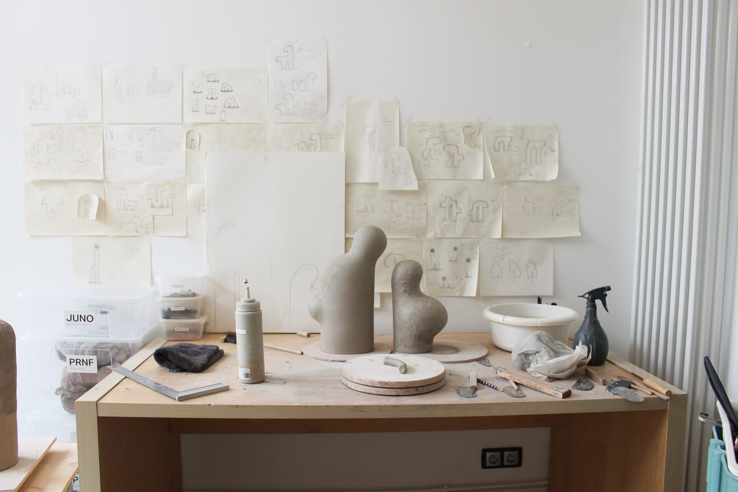 Cette même lampe s’inscrit dans une quête plus large de fusion entre textile et céramique — un langage sensible nourri par le parcours singulier de l’artiste, passée par la mode avant de revenir à une pratique manuelle plus alignée avec ses valeurs et ses interrogations sur la matière.