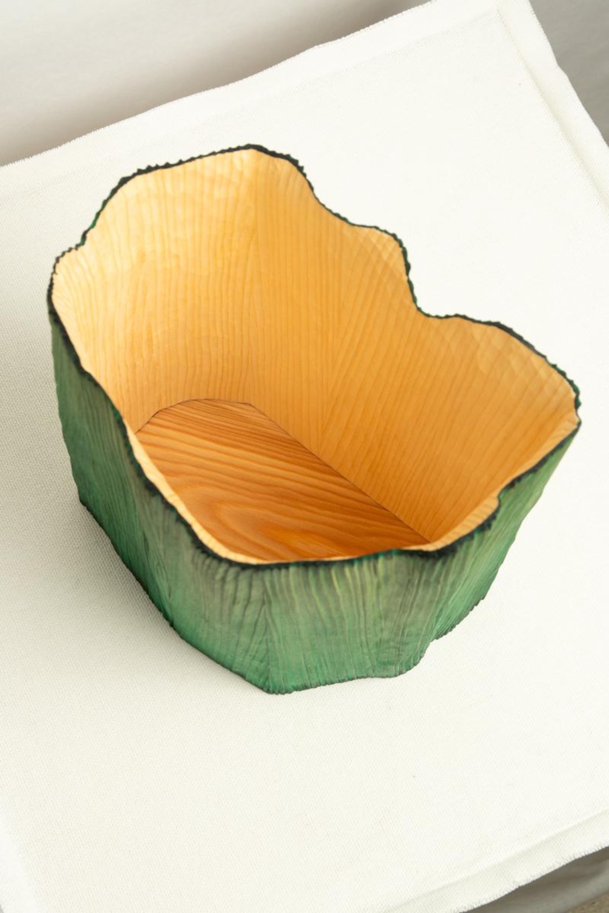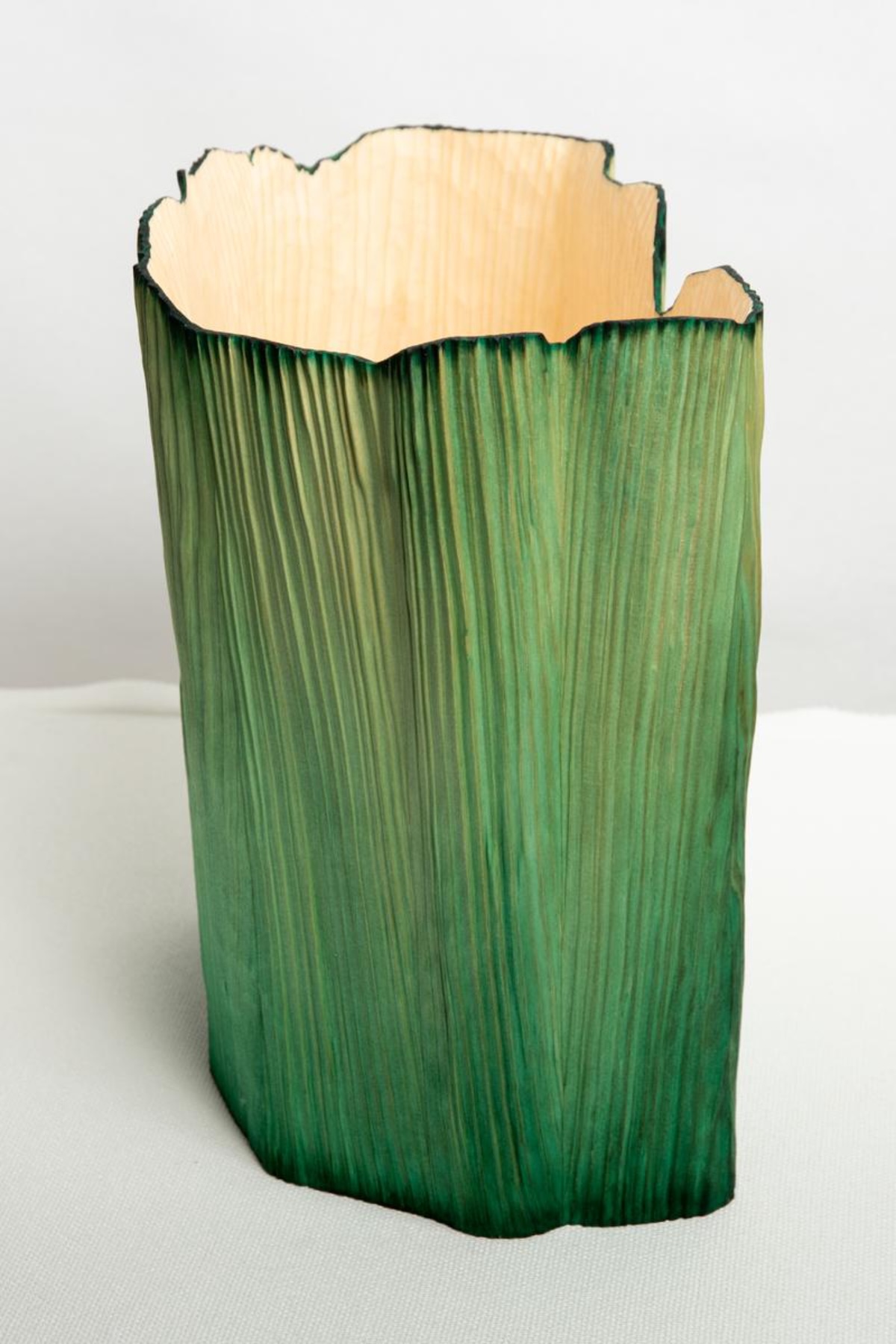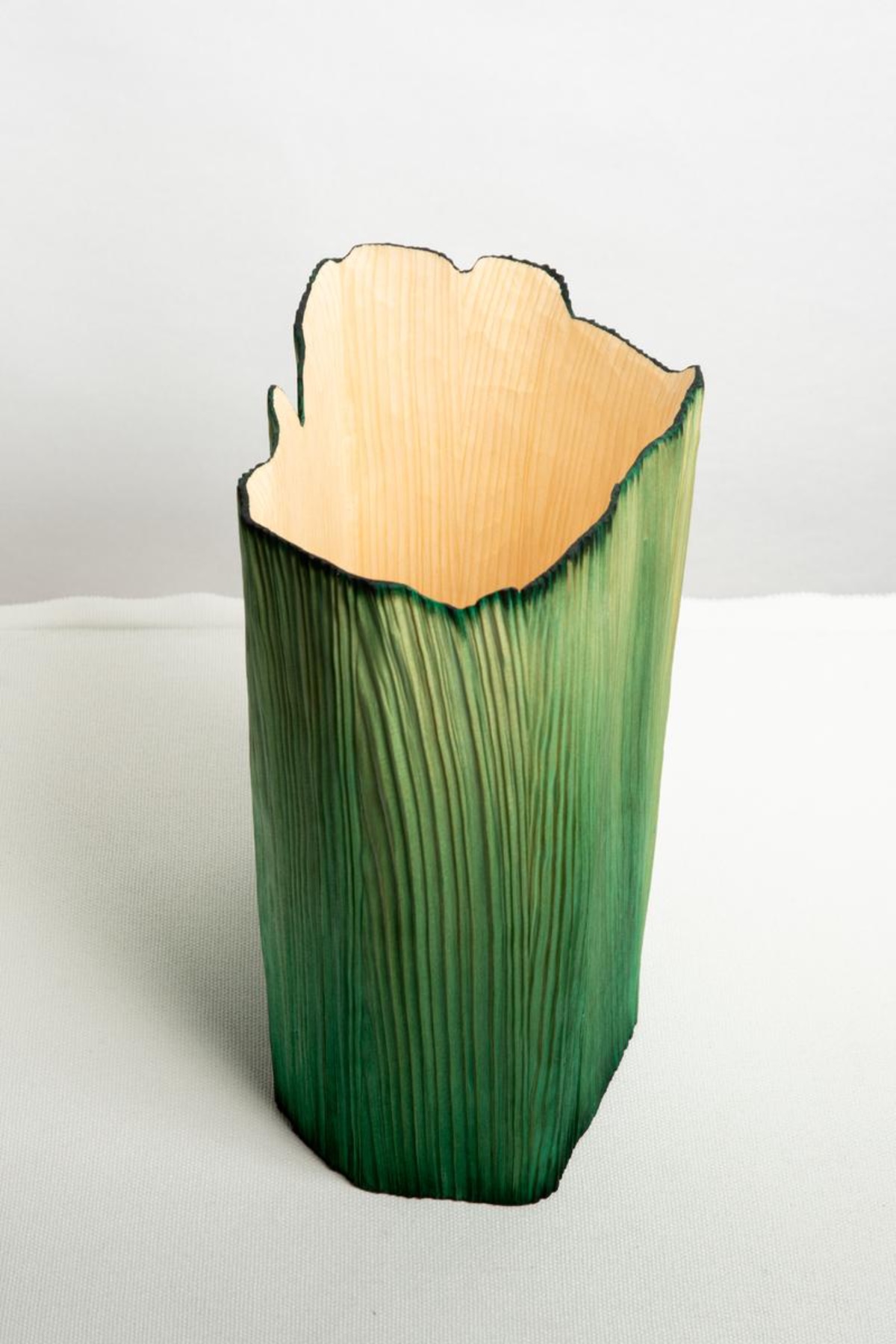 Chaque pièce de la collection est façonnée en dialogue avec la structure naturelle du bois. Dans le cas du vase Pleats, la forme suit directement la torsion interne des fibres du bois à l’intérieur du tronc.