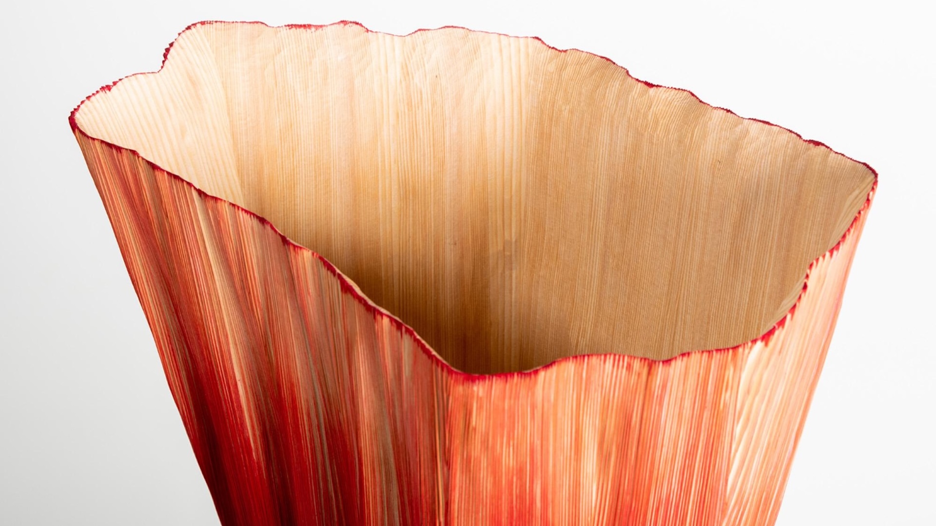 Chaque pièce de la collection est façonnée en dialogue avec la structure naturelle du bois. Dans le cas du vase Pleats, la forme suit directement la torsion interne des fibres du bois à l’intérieur du tronc.