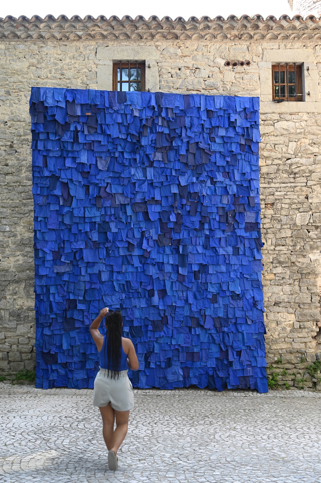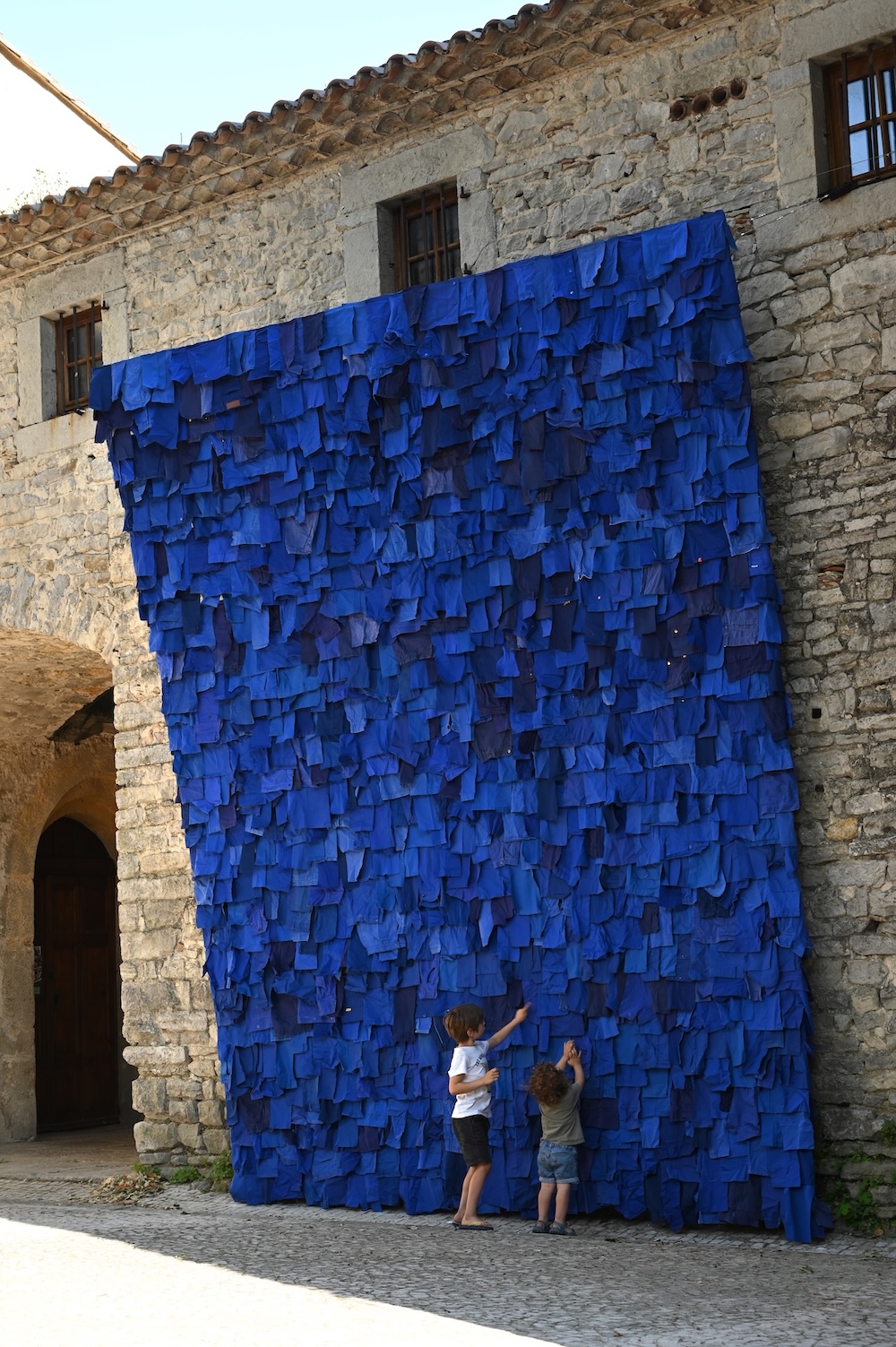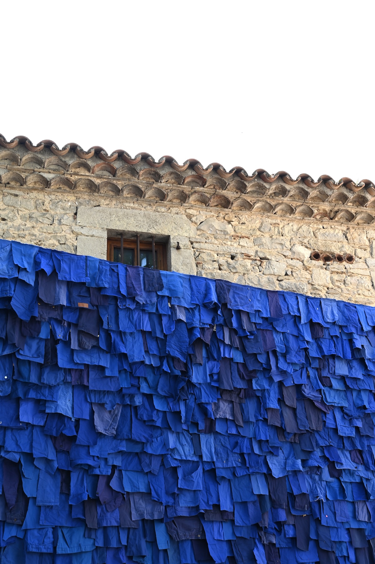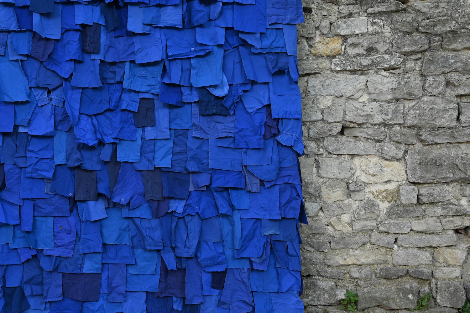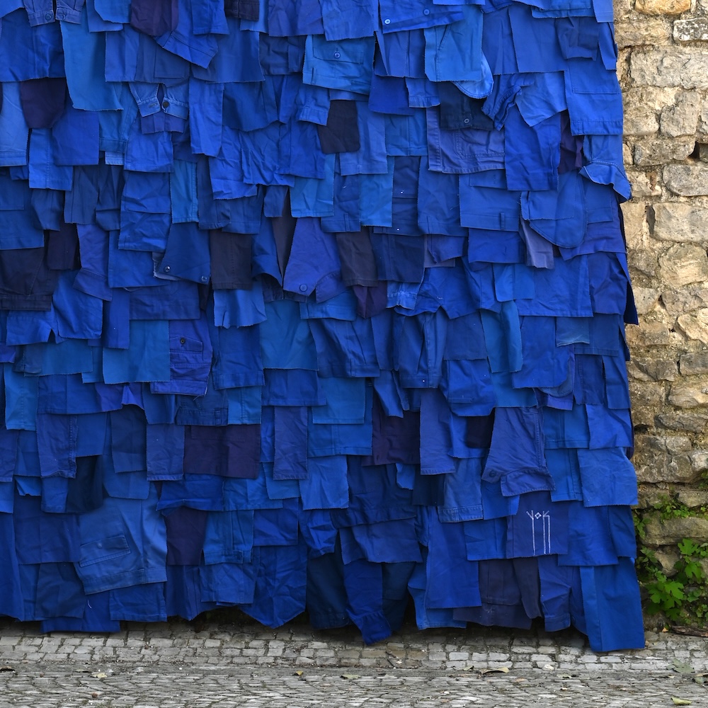 PatchWork se déploie sur le grand mur de la place entre l’église et le château. L’installation met en scène des bleus de travail récupérés. L’agrégation morcelée de ce tissu spécifique reconstitue un collectif imaginaire lié physiquement au monde du travail, uni par la forme et le monochrome.