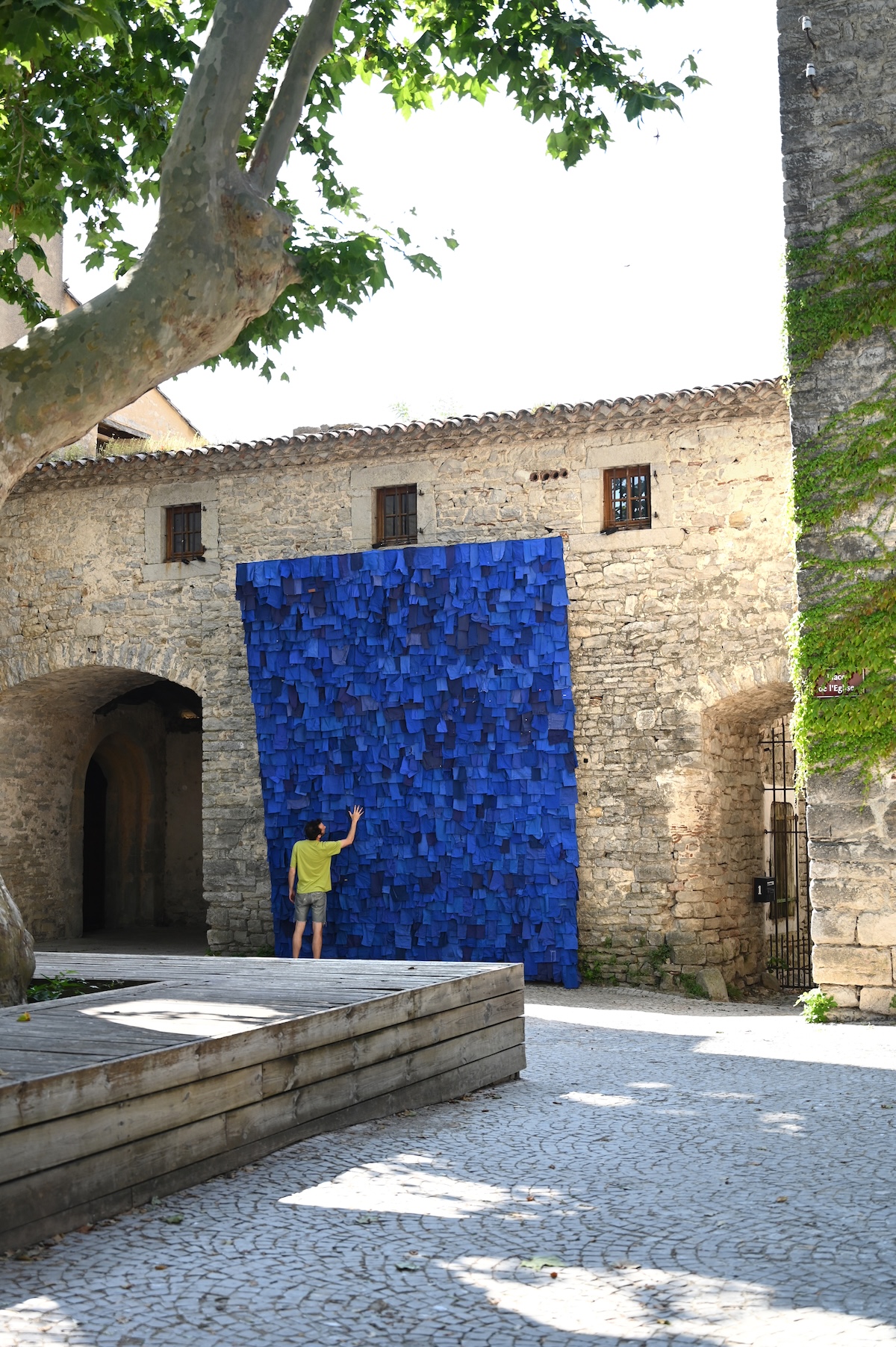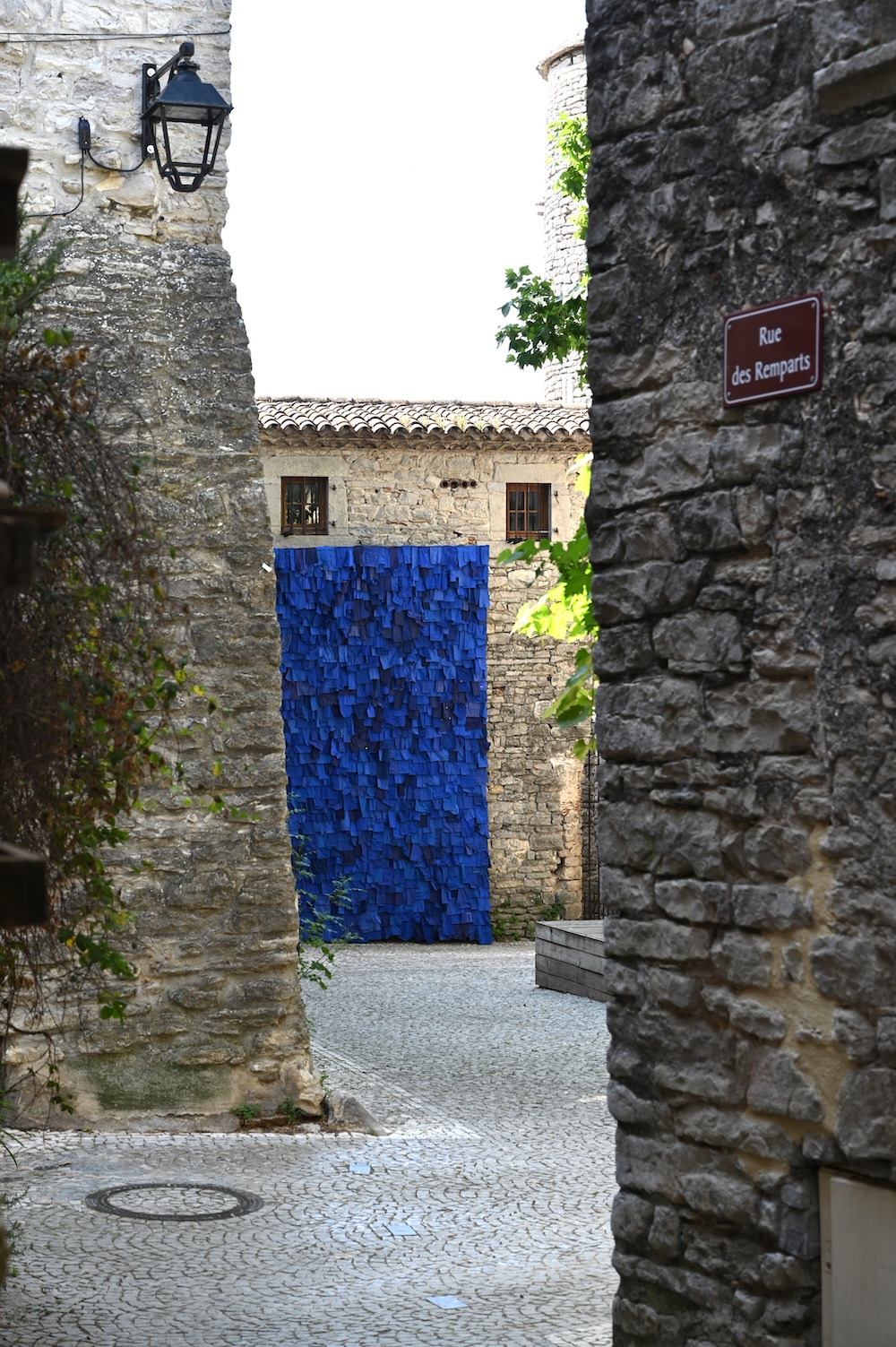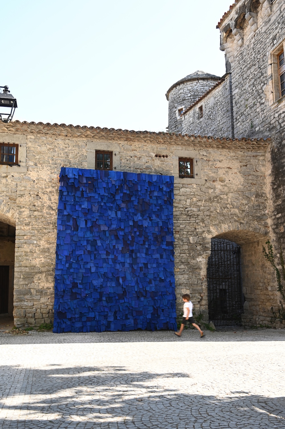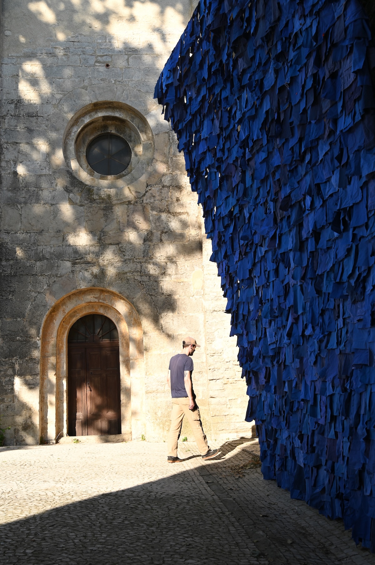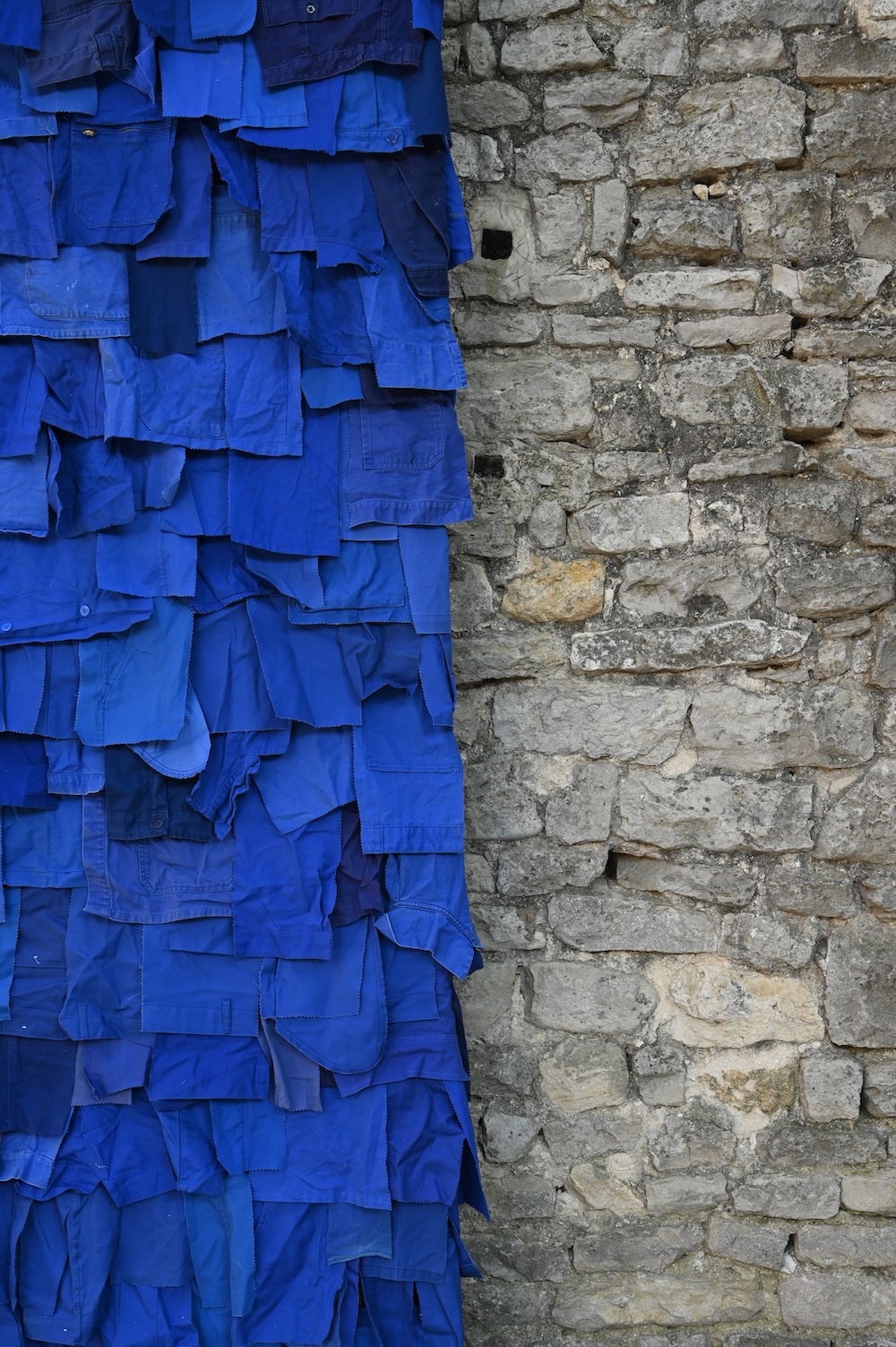 PatchWork se déploie sur le grand mur de la place entre l’église et le château. L’installation met en scène des bleus de travail récupérés. L’agrégation morcelée de ce tissu spécifique reconstitue un collectif imaginaire lié physiquement au monde du travail, uni par la forme et le monochrome.