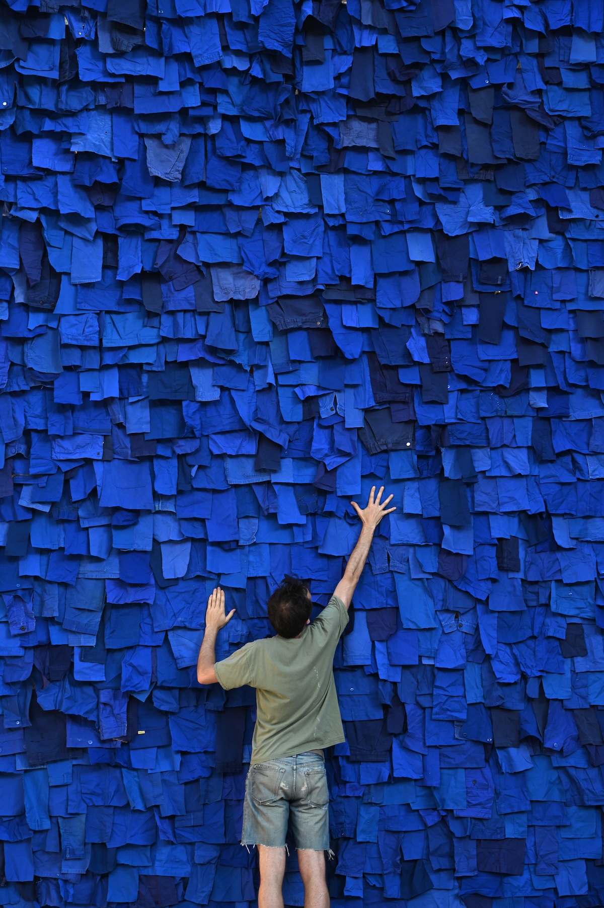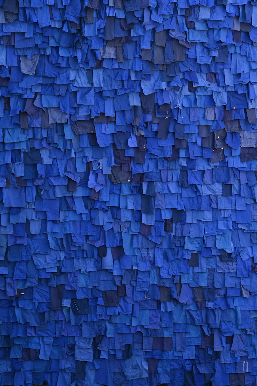 Dans la continuité de son travail sur le fil et la couleur, YokYok explore la transformation de tissus de vêtements récupérés. Ici le « bleu de travail » usé ou issu de surproductions ou de fin de stocks évoque une activité artisanale et surtout industrielle qui résonne avec le passé ouvrier des villes de l’Est Parisien, où YokYok travaille.