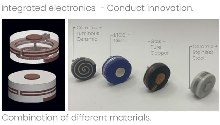 À gauche : ce graphique CAO montre un exemple de structure complexe multi-matériaux avec structure conductrice intégrée, par exemple pour un circuit de chauffage ou un capteur. À droite : exemples de composants imprimés en 3D à partir de matériaux combinés de manière ciblée pour une utilisation dans l’électronique (de gauche à droite : céramique + céramique luminescente, LTCC + argent, verre + cuivre pur, céramique + acier inoxydable).