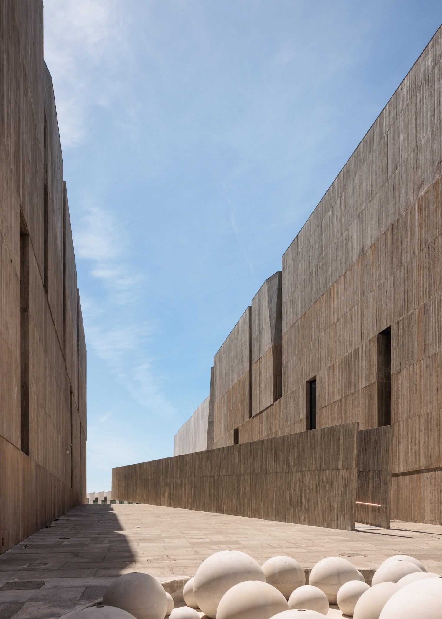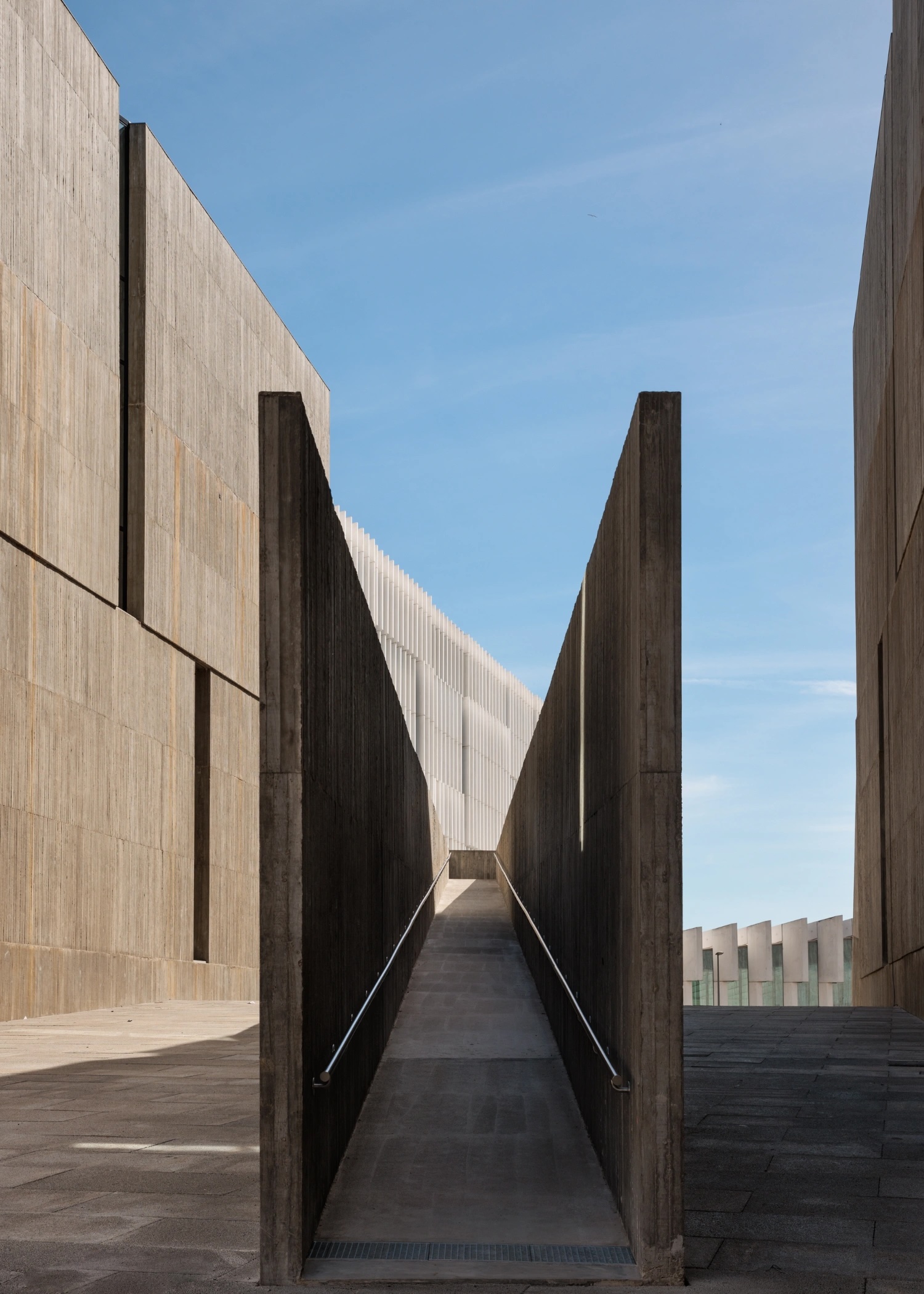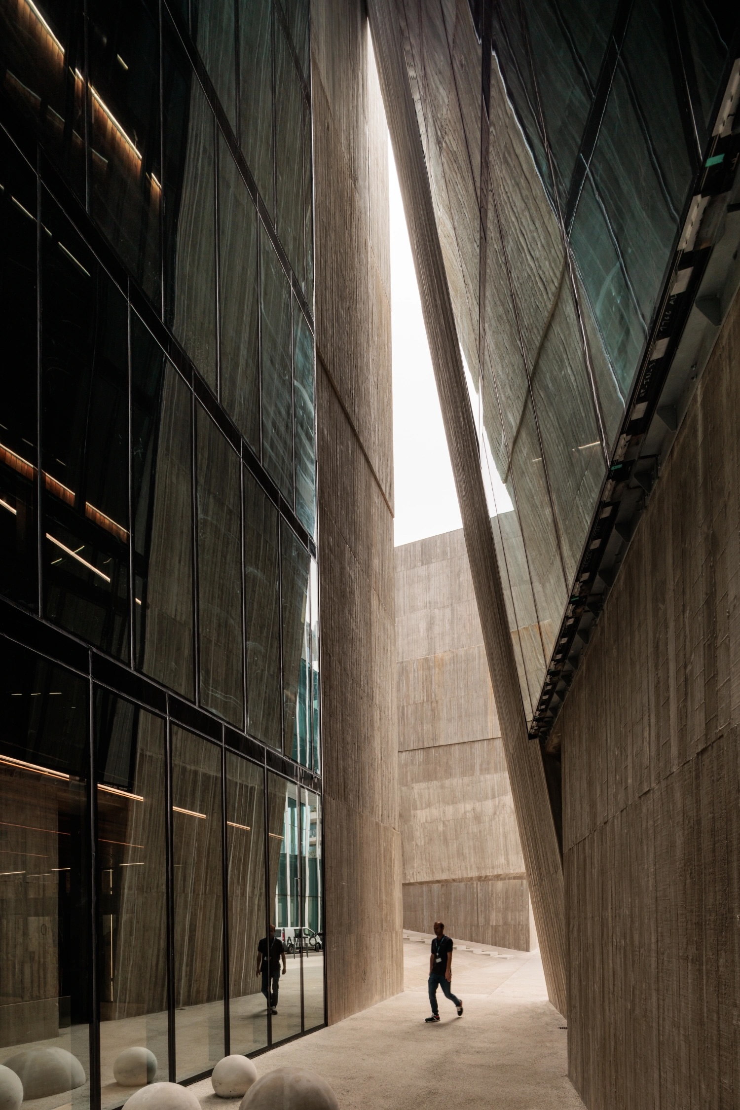 Une place publique sculptée et monolithique accentue la masse thermique, éliminant la traditionnelle stratification du sol et imprégnant le complexe d’une dignité monumentale. Dans un contraste saisissant mais complémentaire, les façades périphériques déploient des grilles rythmiques de brise-soleil et de vitrages encastrés, conférant à l’environnement de bureau une dimension confortable et domestique, atténuant les apports solaires et améliorant le confort intérieur.