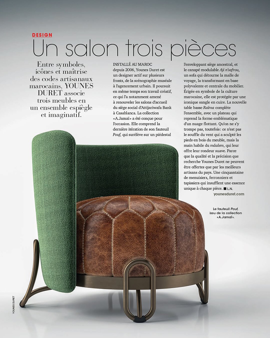 Sous le titre « Un salon trois pièces », le magazine présente le fauteuil Pouf, le canapé modulable Aji nsfrouh et la table basse Raiïna – un trio qui revisite les codes artisanaux marocains avec un regard contemporain.