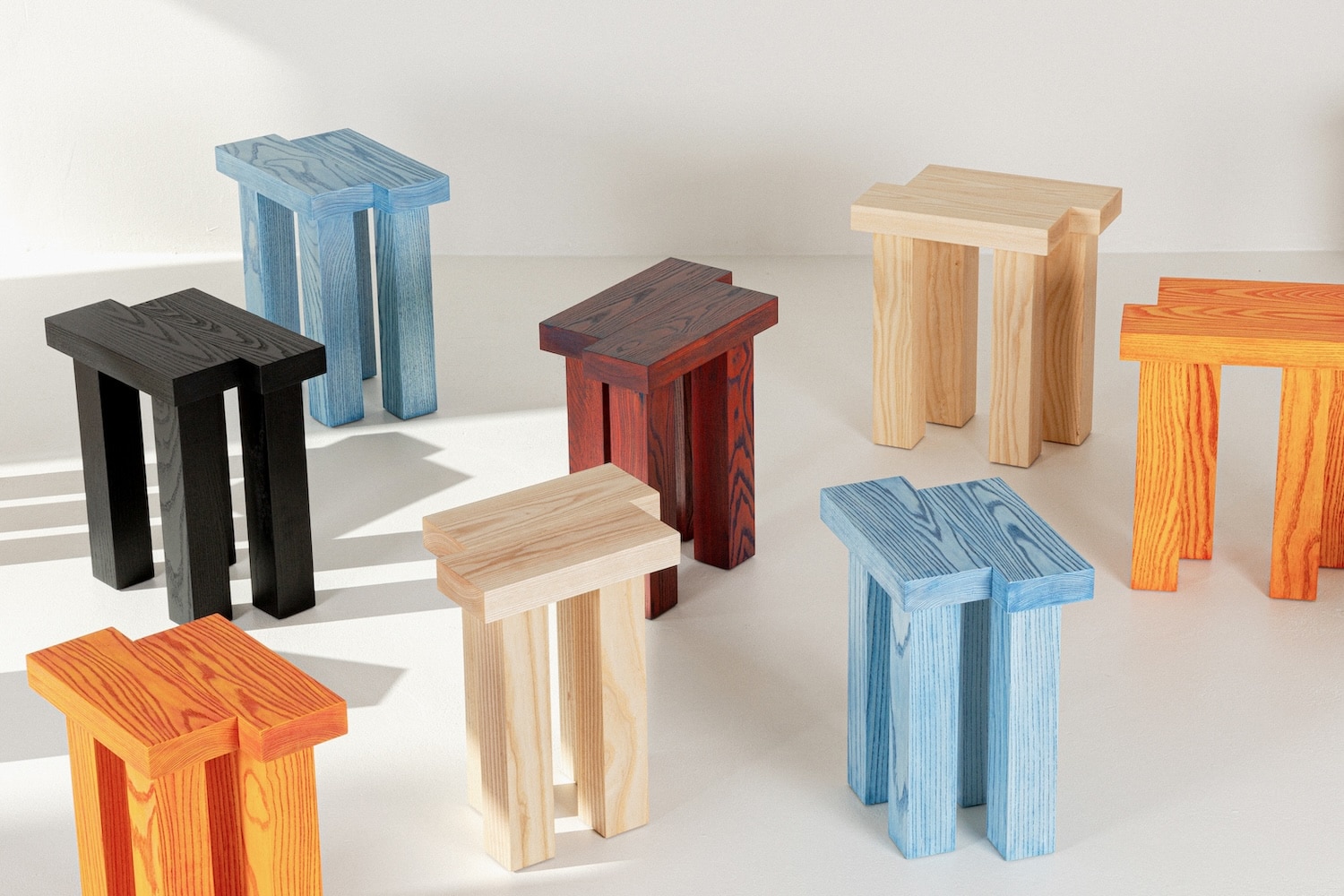 Les créations, comme le Elements Stool, sont pensées dans une logique de contraste maîtrisé : le bois brut est mis en dialogue avec des finitions, huile, différentes couleurs, qui créent des rythmes poétiques. Même si certains mariages de matériaux ou de finitions peuvent sembler audacieux, ils révèlent ensuite une harmonie discrète et surprenante dans un contexte donné.