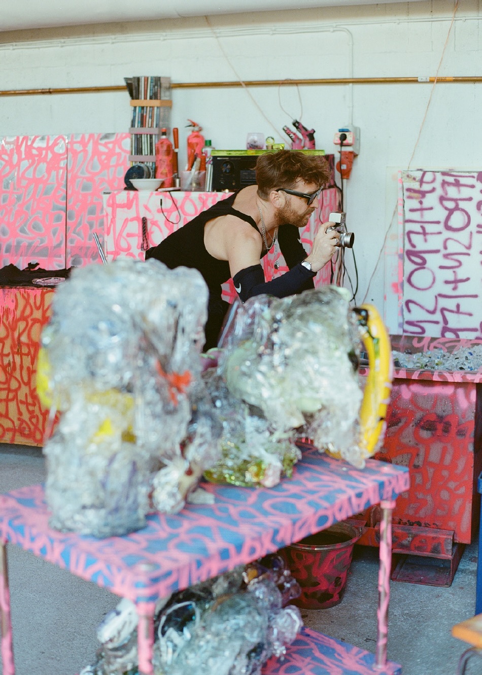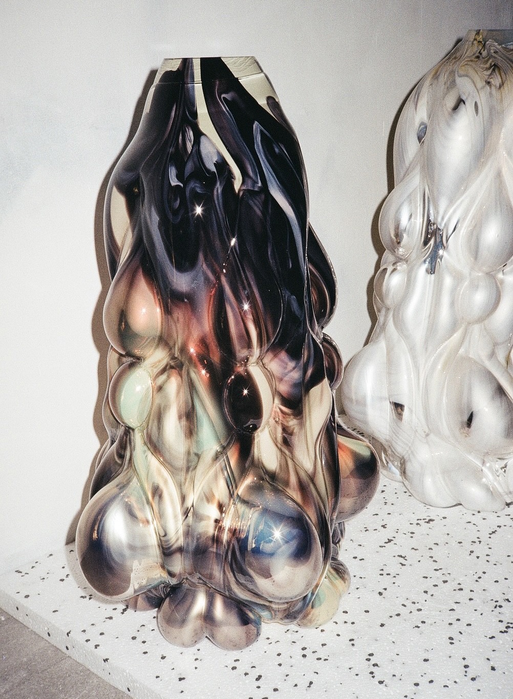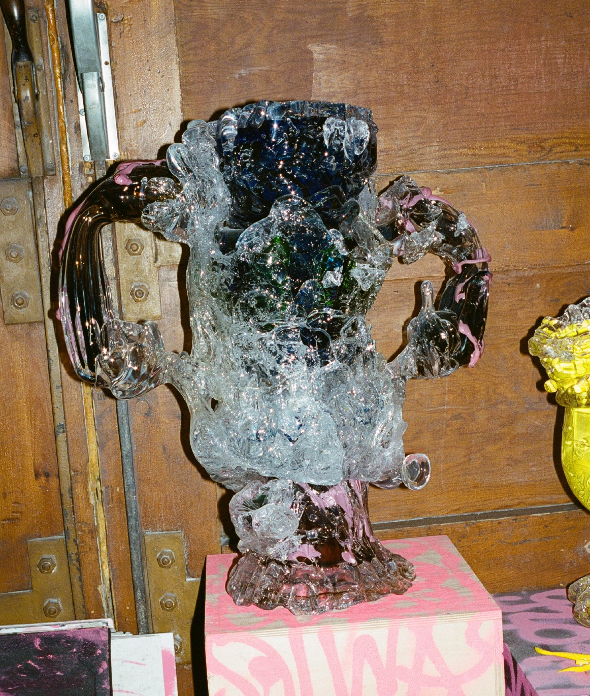 Comme le ferait un peintre, il superpose différentes couches, créant de nouveaux effets visuels, et façonne un nouveau corps de verre puissant aux contours flous. On y trouve des fissures, de la transparence, de l’opacité, des surfaces lisses et rugueuses. En post-production, une sculpture peut recevoir un coup de bombe de peinture, ou passer par un garage automobile pour être laquée d’une peinture métallique. La musique, le graffiti et la culture pop sont des moteurs essentiels de son processus créatif.