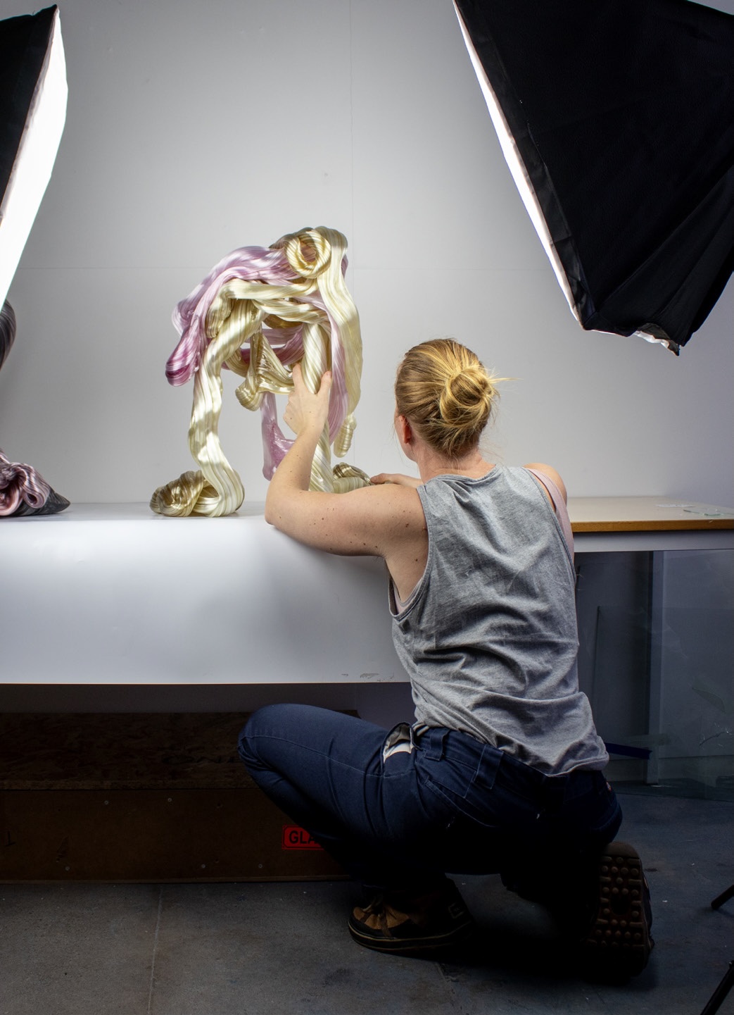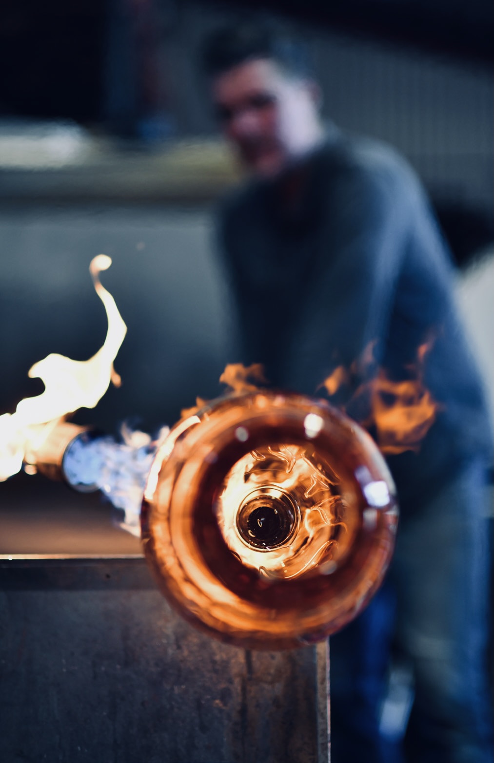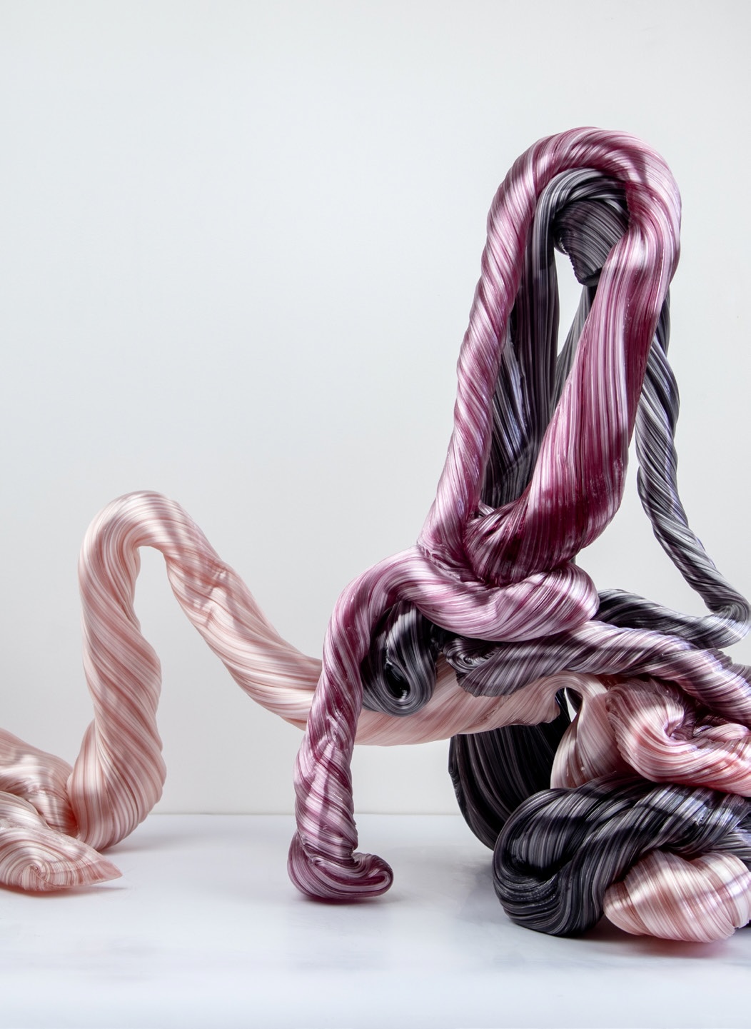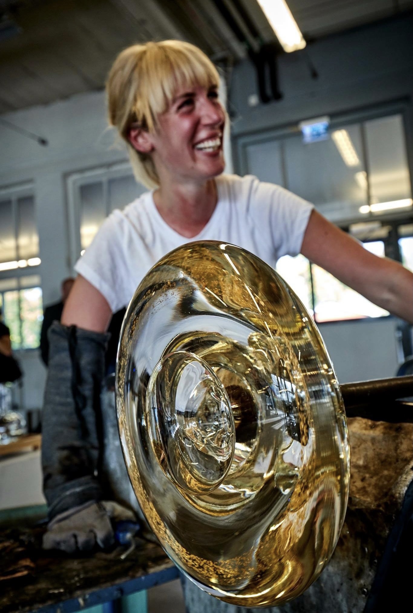 Les oeuvres de Maria Bang Espersen (née en 1981) frappent par leur pouvoir d’attraction immédiat. Elles sont d’un genre totalement nouveau, hors des conventions et des attentes habituelles. C’est que depuis de nombreuses années, elle explore sans relâche de nouvelles techniques et expressions artistiques. Elle a développé sa propre méthode consistant à étirer et replier le verre fondu à plusieurs reprises, comme dans la fabrication des bonbons en sucre filé. Elle décrit son travail comme une sorte de jeu expérimental. Le processus est intense, rapide, imprévisible, et requiert une concentration totale pour intervenir avant que le verre ne refroidisse. À la fin, elle détache le verre de la canne et la façonne à la main. C’est une étape cruciale qui impose des choix esthétiques rapides et une grande souplesse. Contrairement à la verrerie traditionnelle qui repose sur la maîtrise, son approche consiste à comprendre le verre, à coopérer avec sa volonté propre et ses caprices. L’équilibre entre contrôle et hasard rend chaque sculpture unique, et chaque séance à l’atelier est un pari.