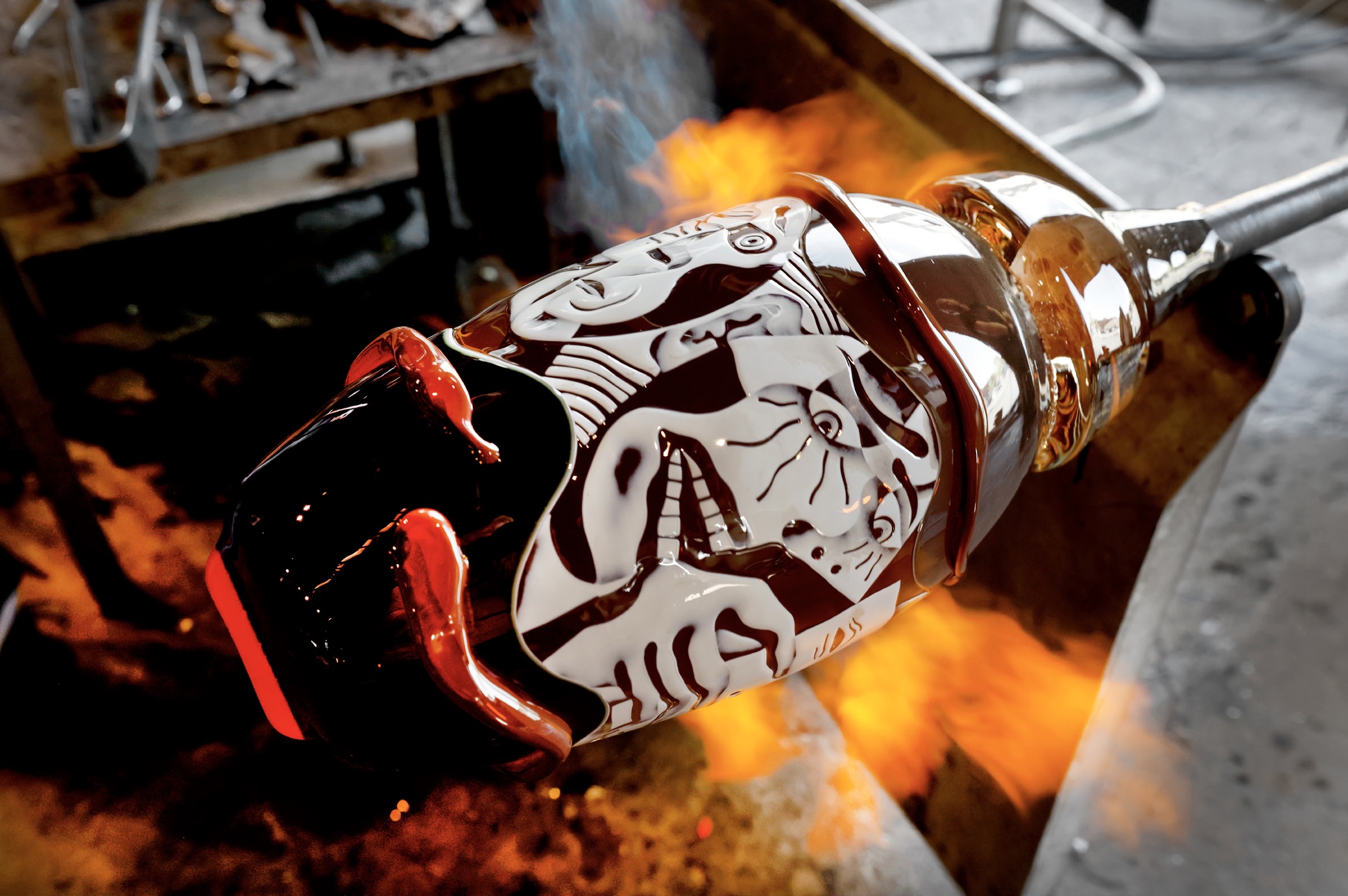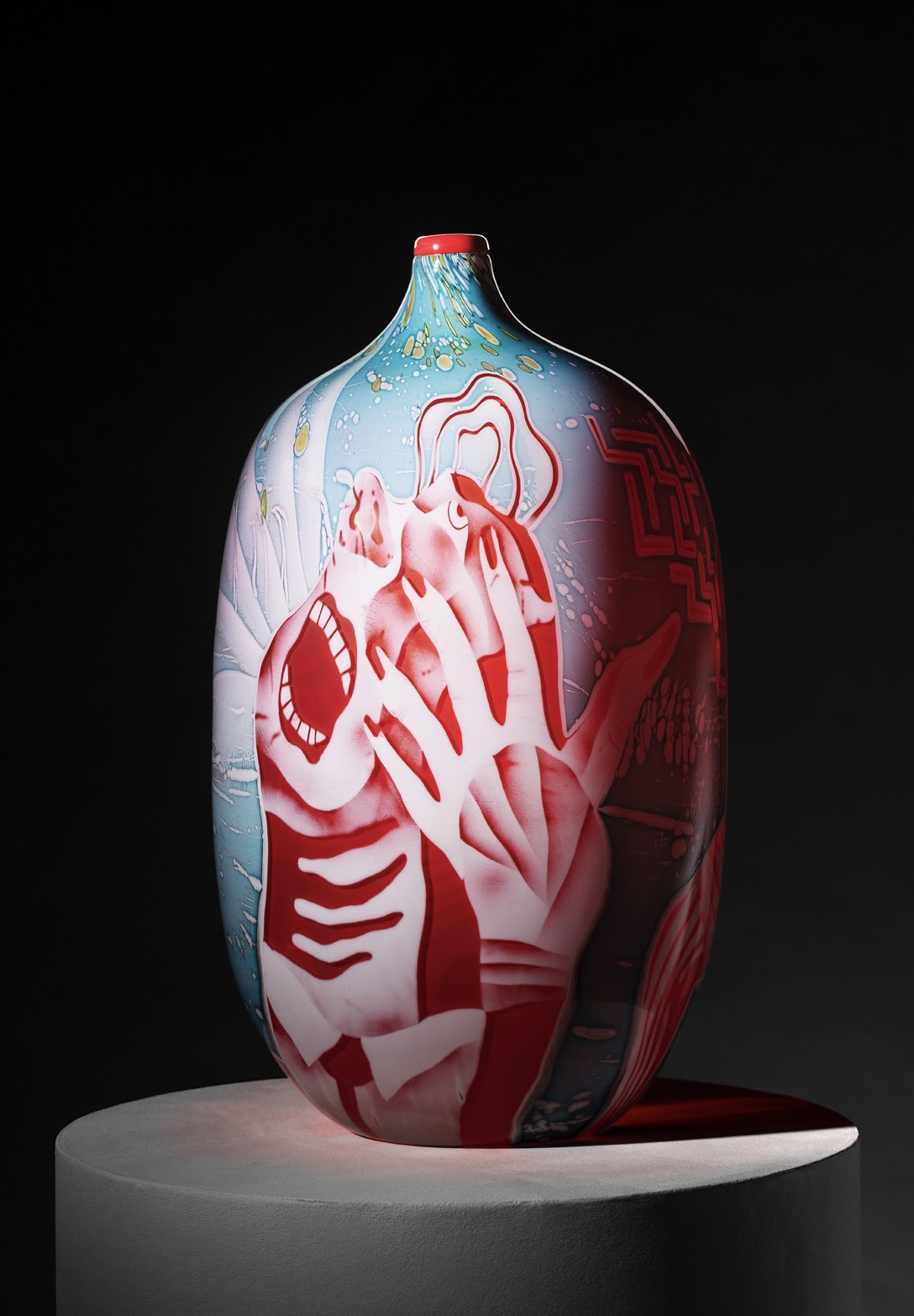 La narration est au coeur du travail artistique de Peter Hermansson (né en 1975). Au cours des quinze dernières années, il a perfectionné et réinventé avec brio la technique suédoise classique du graal. Cette méthode complexe et chronophage, développée au début du 20e siècle au sein de la manufacture d’Orrefors, consiste à superposer des couches de verre coloré et à créer une paraison (une boule de verre soufflée, qui pourra ensuite être modelée). Une fois la pièce refroidie, le motif est esquissé, puis les couches superflues sont retirées par sablage et gravure, formant ainsi l’image. Ensuite, la pièce est lentement réchauffée, puis soufflée à sa taille finale sur la canne de verrier.