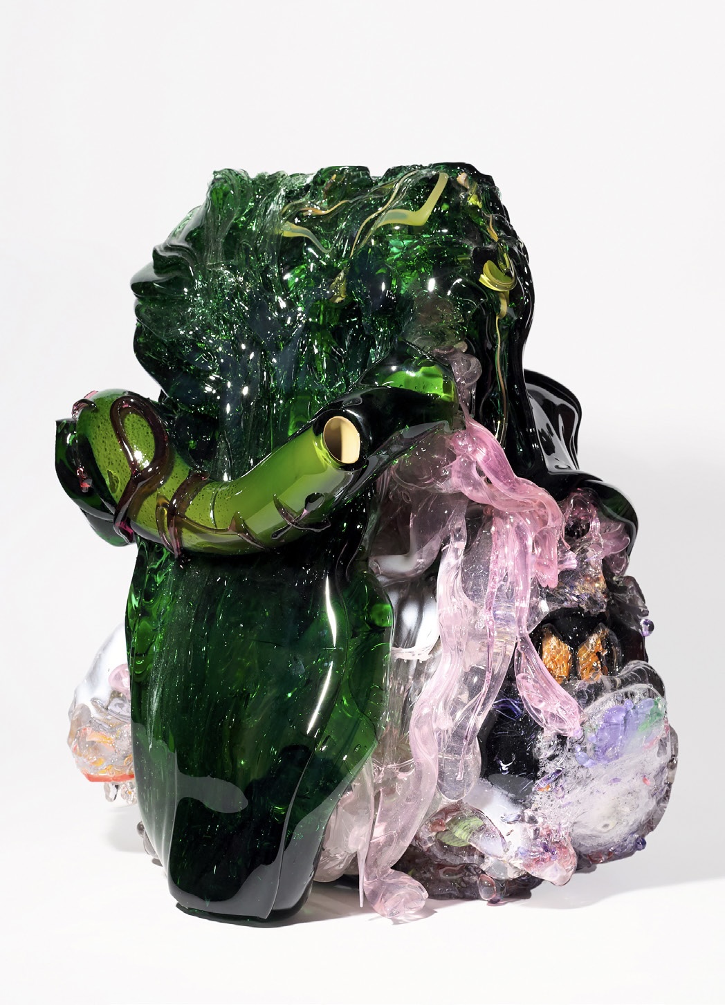 Depuis sa sortie de Konstfack en 2017, la carrière de Hanna Hansdotter (née en 1984) a connu une ascension fulgurante. Avec ses sculptures chatoyantes, exubérantes et baroques, d’un kitsch assumé, elle s’est rapidement imposée comme l’une des étoiles montantes du verre suédois, tant sur la scène nationale qu’internationale. Hansdotter joue avec l’ornementation et les structures graphiques. En soudant entre elles de fines plaques de fer, elle construit des moules ingénieux aux motifs complexes, qui permettent au verre de se dilater partiellement librement. Le résultat : des objets contorsionnés, à la limite de l’effondrement. Des corps de verre voluptueux qui débordent de toutes parts, tout en conservant une rigueur et une précision saisissantes.