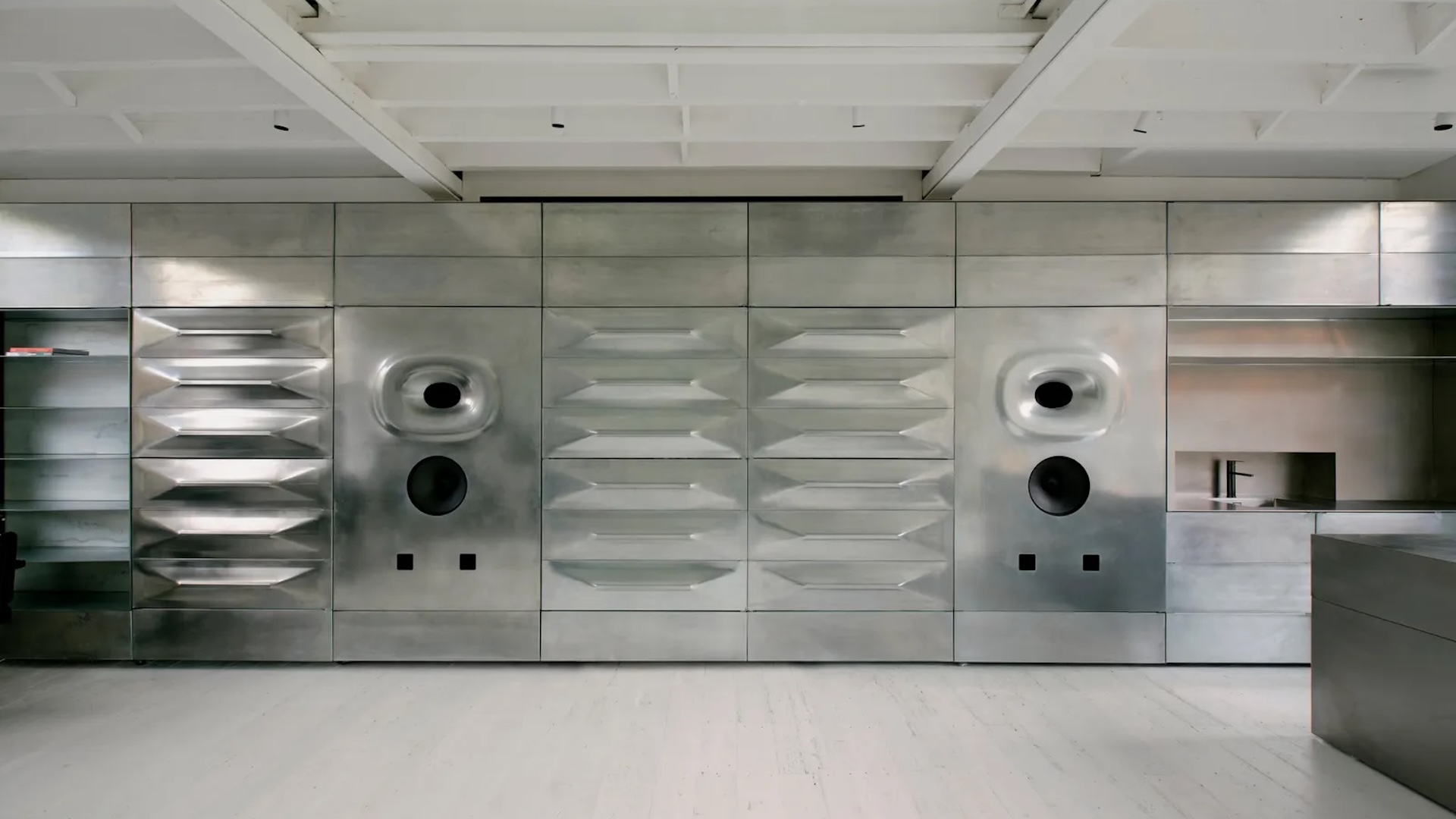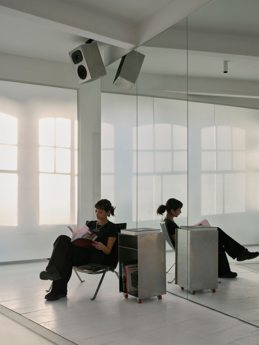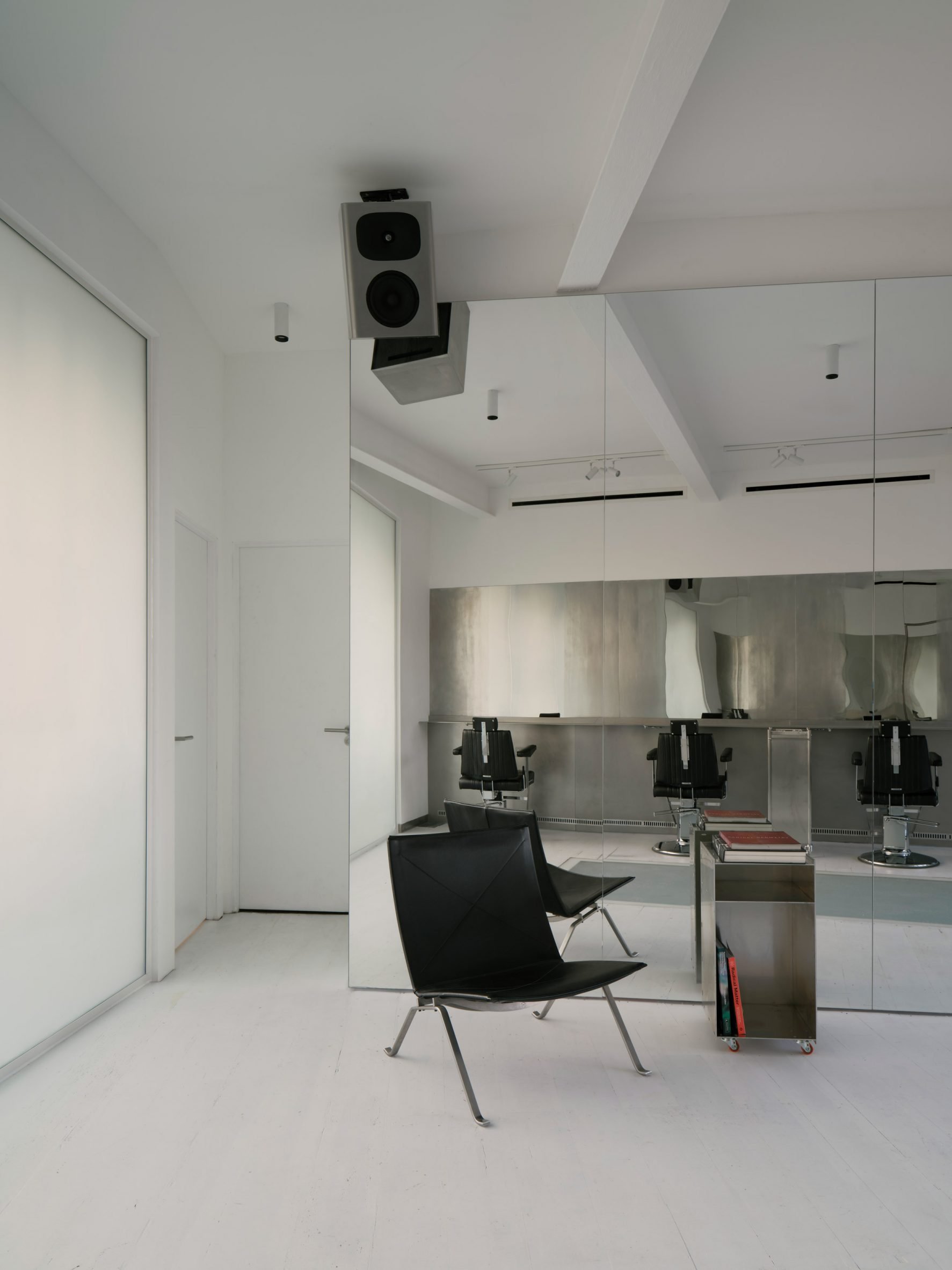 Des enceintes suspendues ponctuent le plan miroir et ancrent visuellement l’espace tout en calibrant le son. Ici, les routines quotidiennes deviennent des rituels intenses, accordés à une chorégraphie de ciseaux, de réflexion et de lignes de basse.