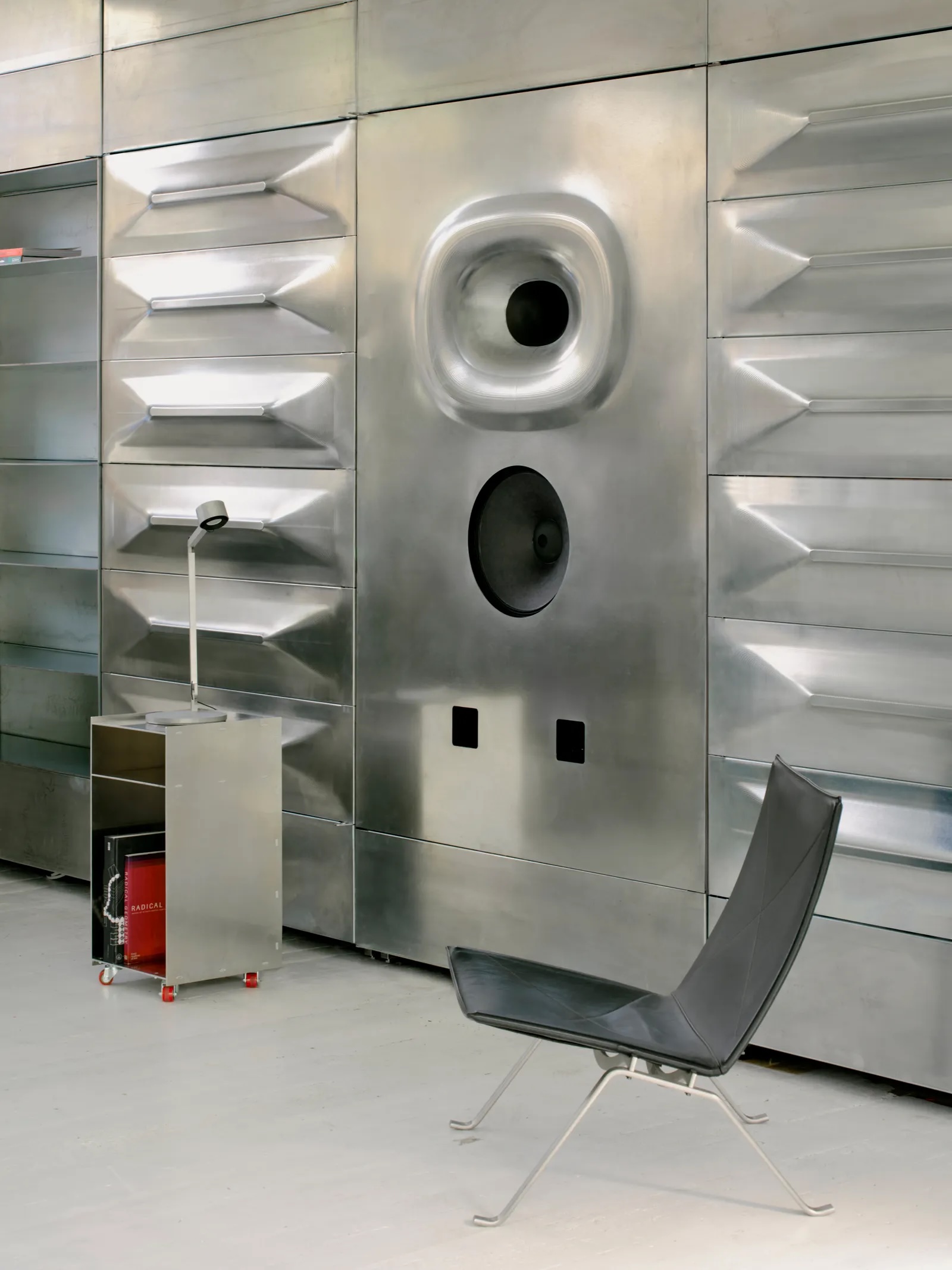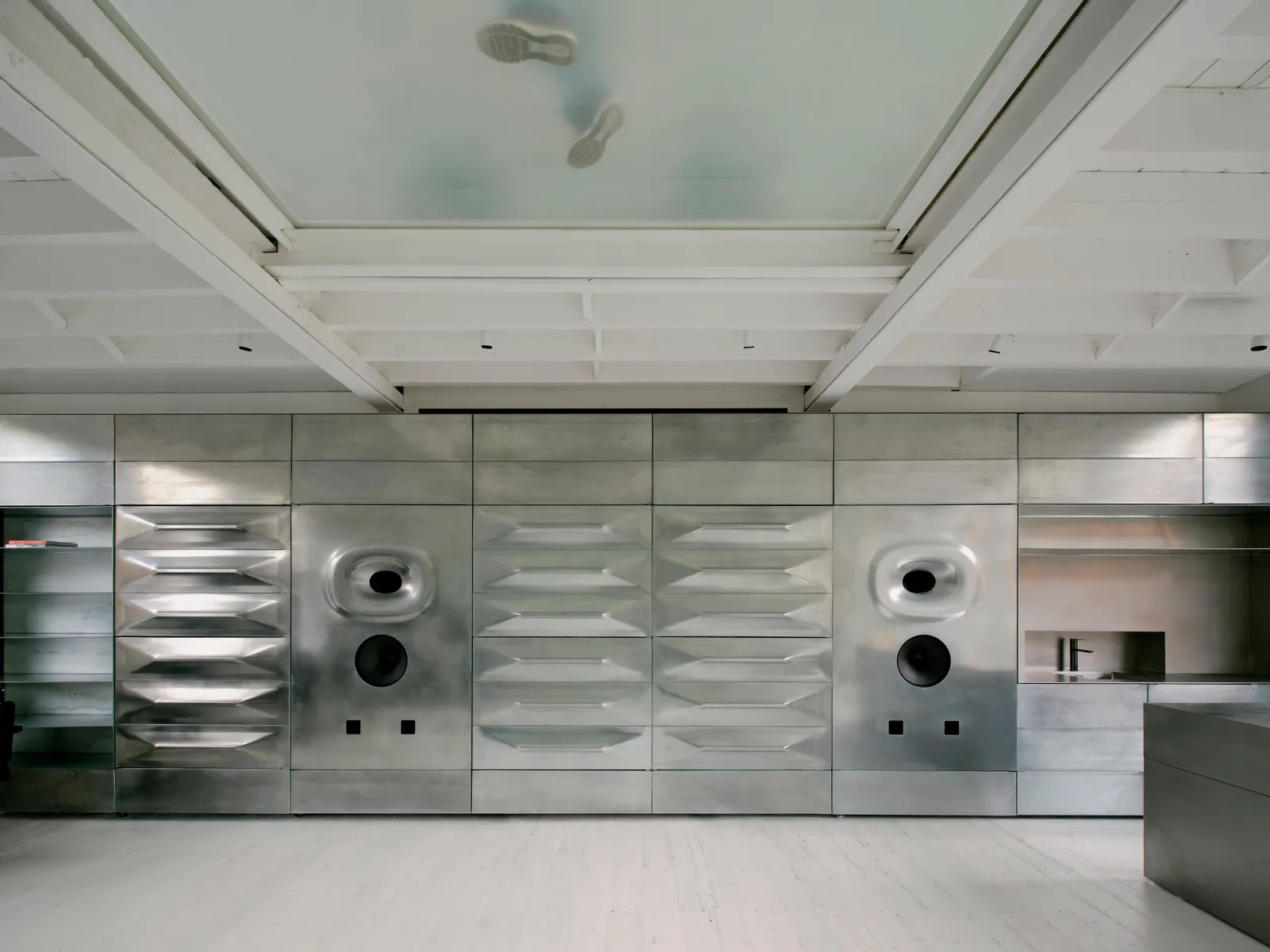 La « Salle d’écoute » au rez-de-chaussée est le cœur de l’espace, bordée de postes de coiffure et d’un bar-réception hybride qui se transforme en salle de concert la nuit. En son centre, deux enceintes monumentales en acier galvanisé, formées numériquement grâce à des techniques de roboformage à faible consommation d’énergie, se dressent tels des totems sculpturaux. Ces enceintes, produites en collaboration avec Friendly Pressure, s’inspirent directement de la culture soundsystem britannique, évoquant à la fois intimité et collectivité.