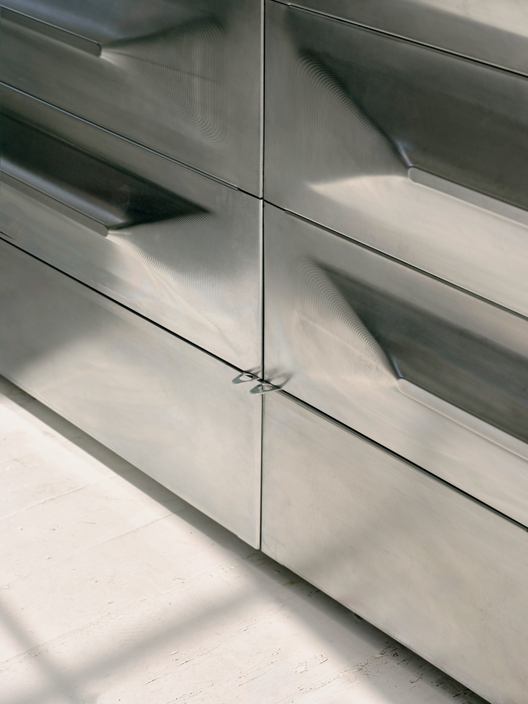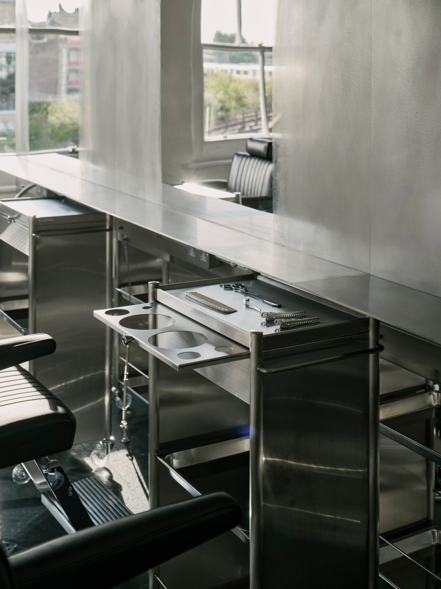 Cette sensibilité hybride se poursuit à l’étage, au « Cutting Floor », où un unique ruban de miroir en acier inoxydable s’enroule autour de la pièce, passant d’un effet flou à un effet de réflexion intense. L’effet est à la fois fonctionnel et atmosphérique, alliant intimité et précision.
