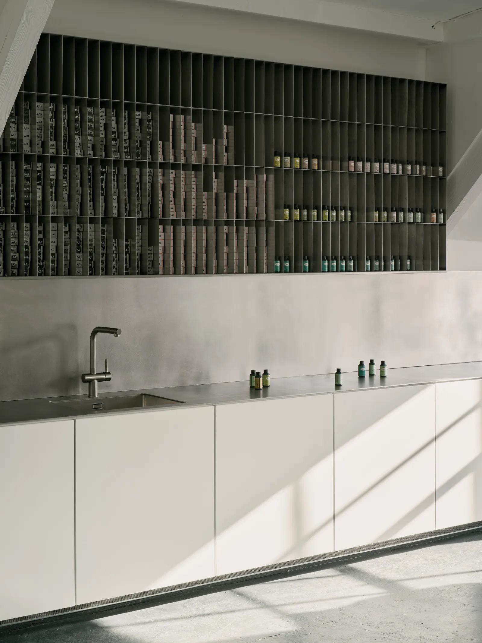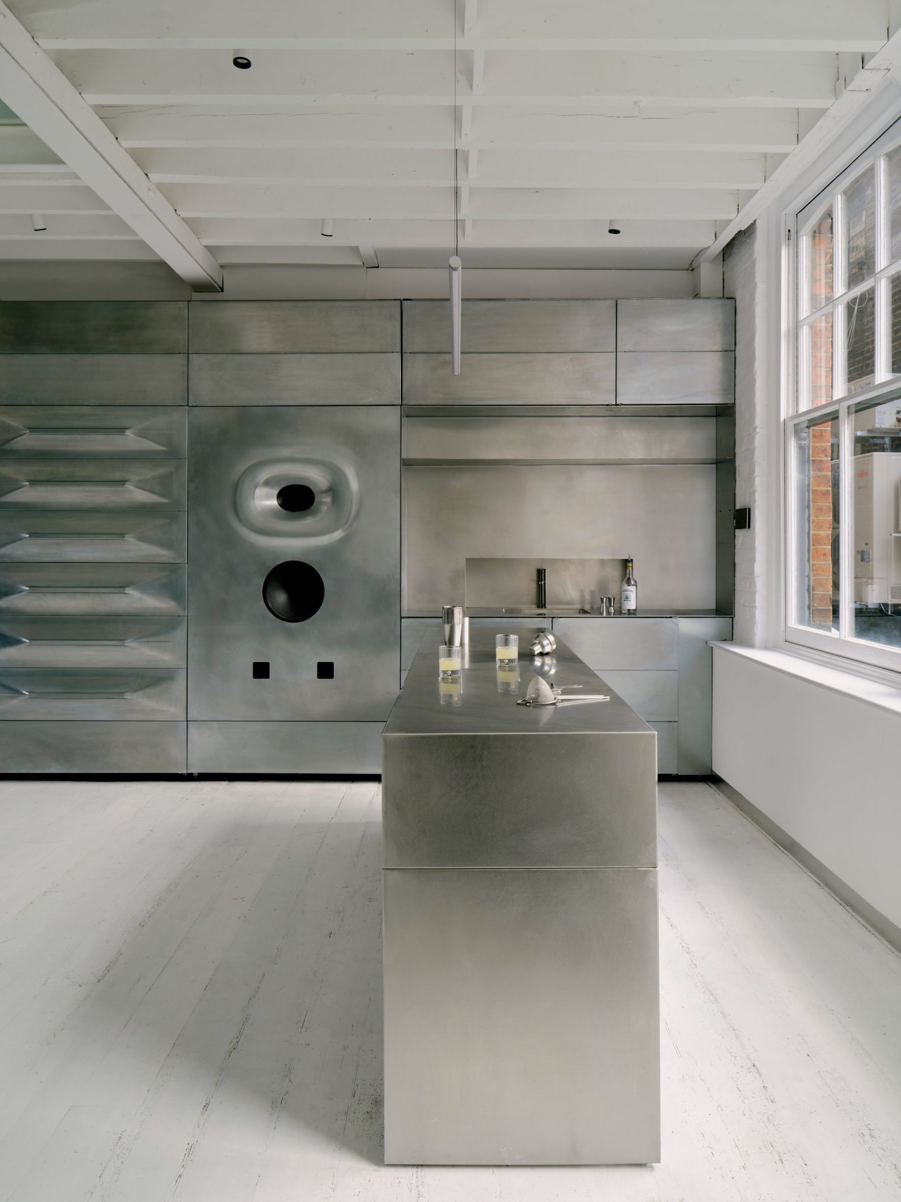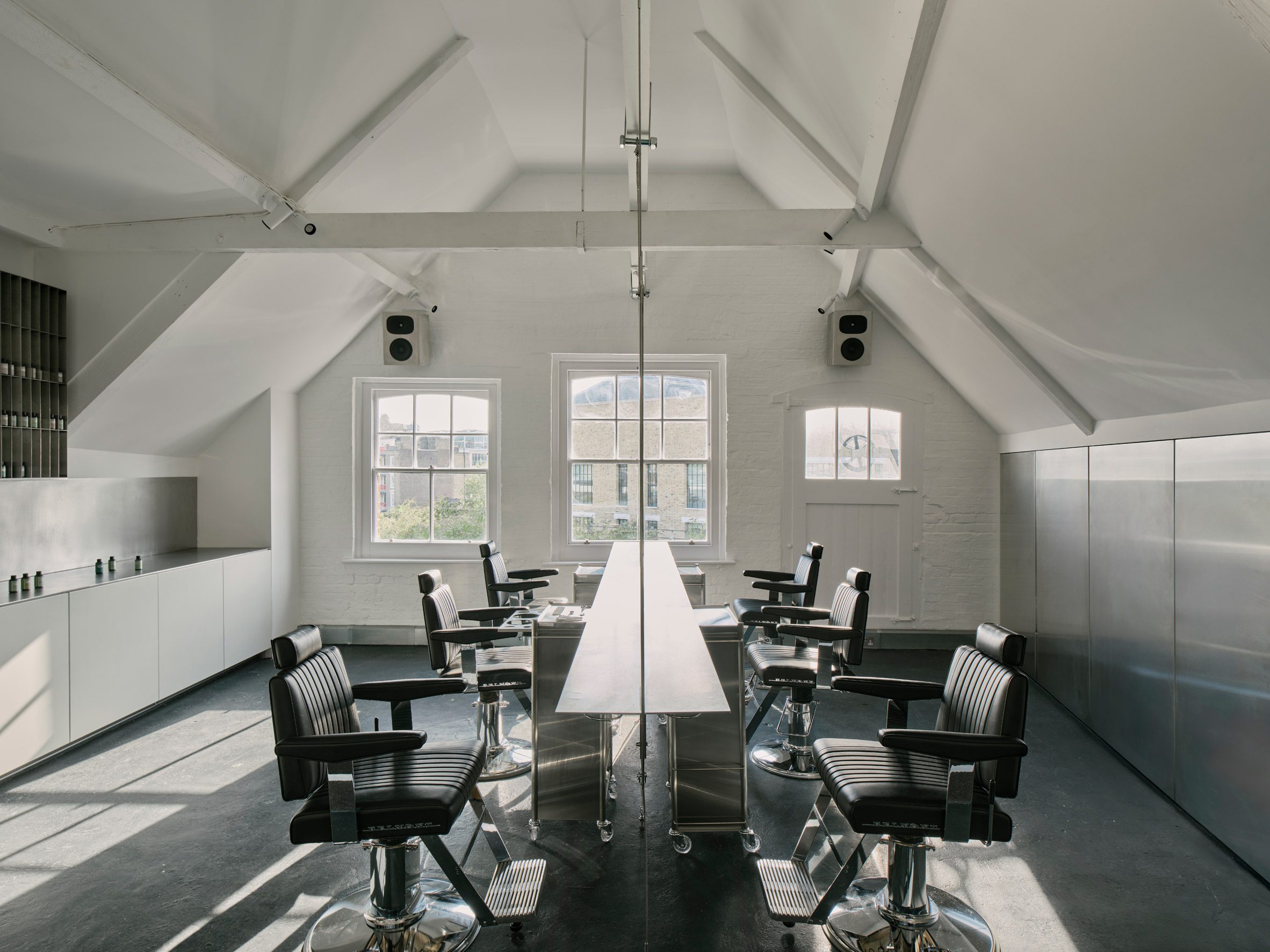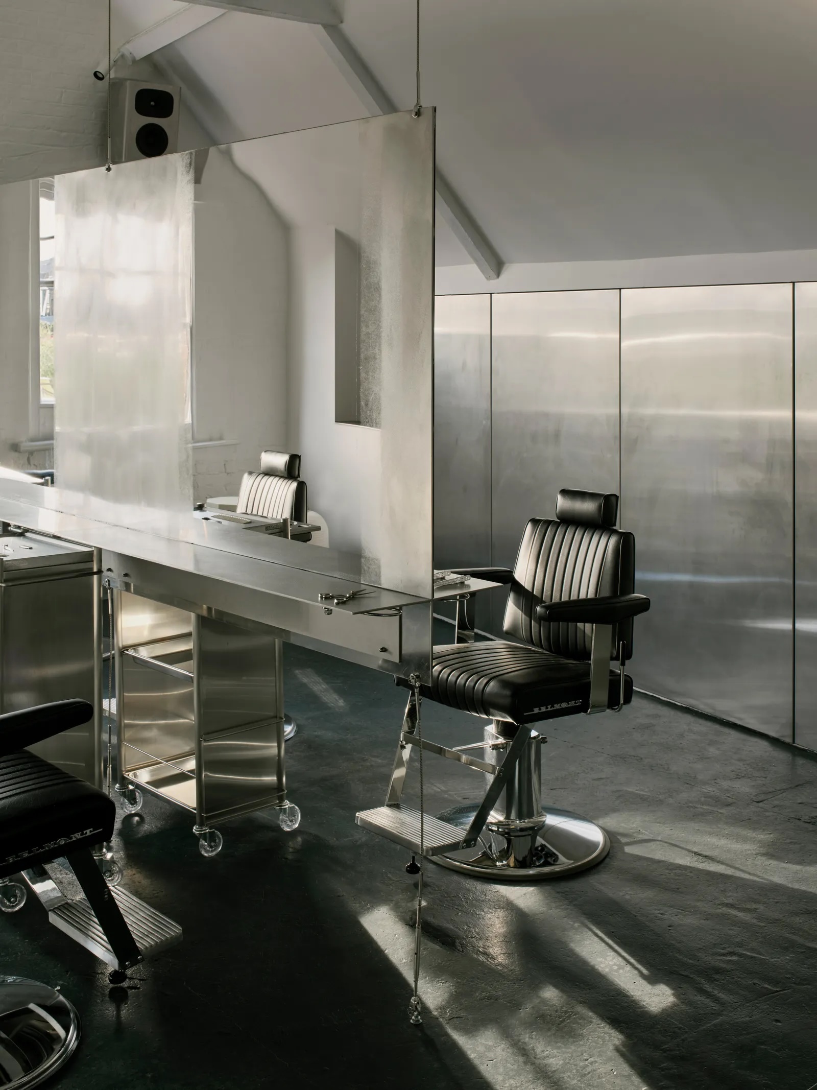 Au niveau supérieur, le « Colour Floor » pousse l’expérimentation des matériaux plus loin. Un poste de travail en miroir en acier inoxydable d’une demi-tonne est suspendu aux chevrons en bois d’origine, sa masse pure servant à la fois de pièce maîtresse sculpturale et de diffuseur acoustique. Au fil du temps, la surface absorbera les taches de teinture, incrustant les traces du processus dans sa peau – une patine évolutive de couleur et de soin.