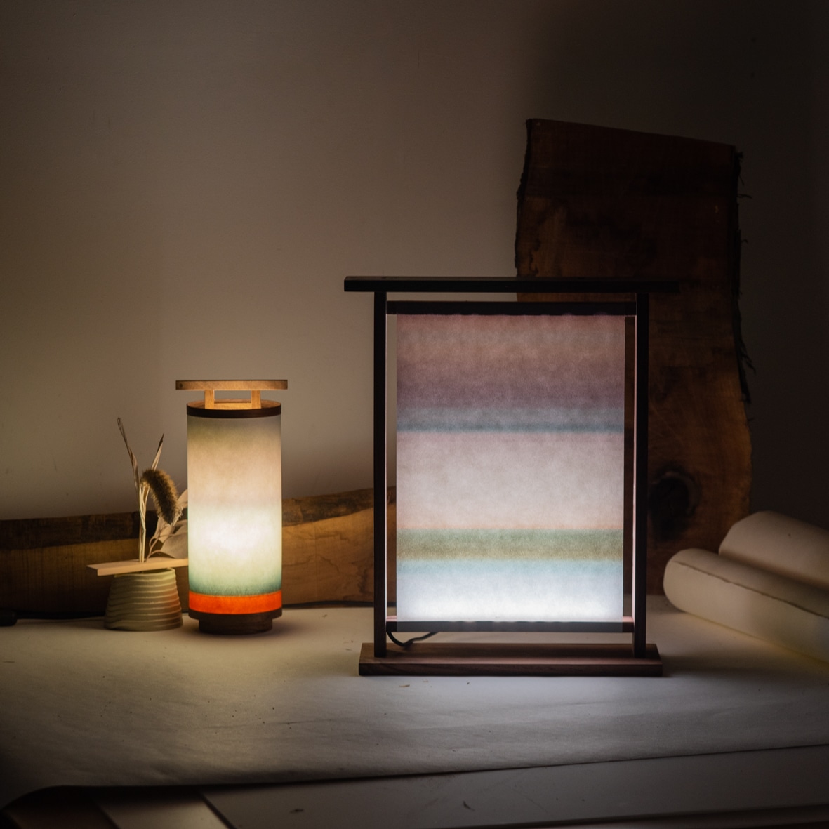 Avec TORII, Maxime Prangé réinterprète le symbole architectural japonais du même nom : un portail marquant l’entrée d’un lieu sacré. Ici, ce sont deux cylindres de papier washi teintés à l’encre végétale qui s’enroulent autour d’un support en bois. Le premier se dévoile sous la lumière du jour, tandis que le second s’illumine de l’intérieur. Cette dualité crée un effet d’apparition subtil, où le paysage ne se donne jamais tout à fait.