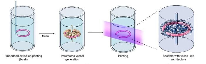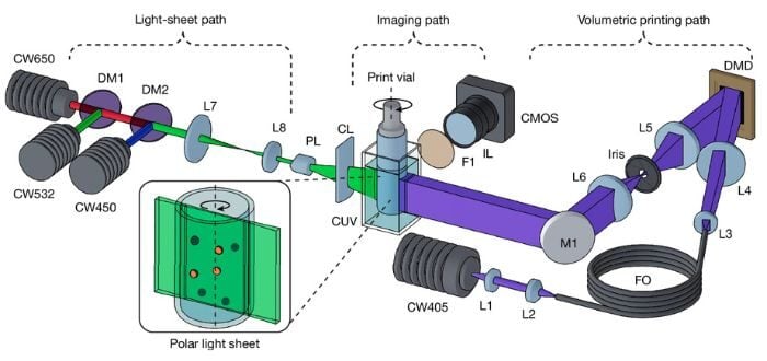 Riccardo Levato est professeur à l’université d’Utrecht et dirige le laboratoire Levato Lab à l’origine de ce procédé GRACE (pour Generative, Adaptive, Context-Aware 3D printing). Avec son équipe, il a cherché à développer une solution de bio-impression plus efficace, intelligente et fiable. Rapidement, il s’est tourné vers l’impression volumétrique : au lieu de déposer des couches successives de cellules, on vient solidifier un gel photosensible en une seule fois pour créer la structure complète. Riccardo Levato explique : “Pour construire une structure, nous projetons une série de motifs lumineux dans un tube rotatif rempli de gel photosensible et de cellules. Là où les faisceaux lumineux convergent, le matériau se solidifie. Cela permet de créer un objet 3D complet en une seule fois, sans avoir à toucher les cellules.” Le procédé est plus rapide et moins dangereux pour les cellules.