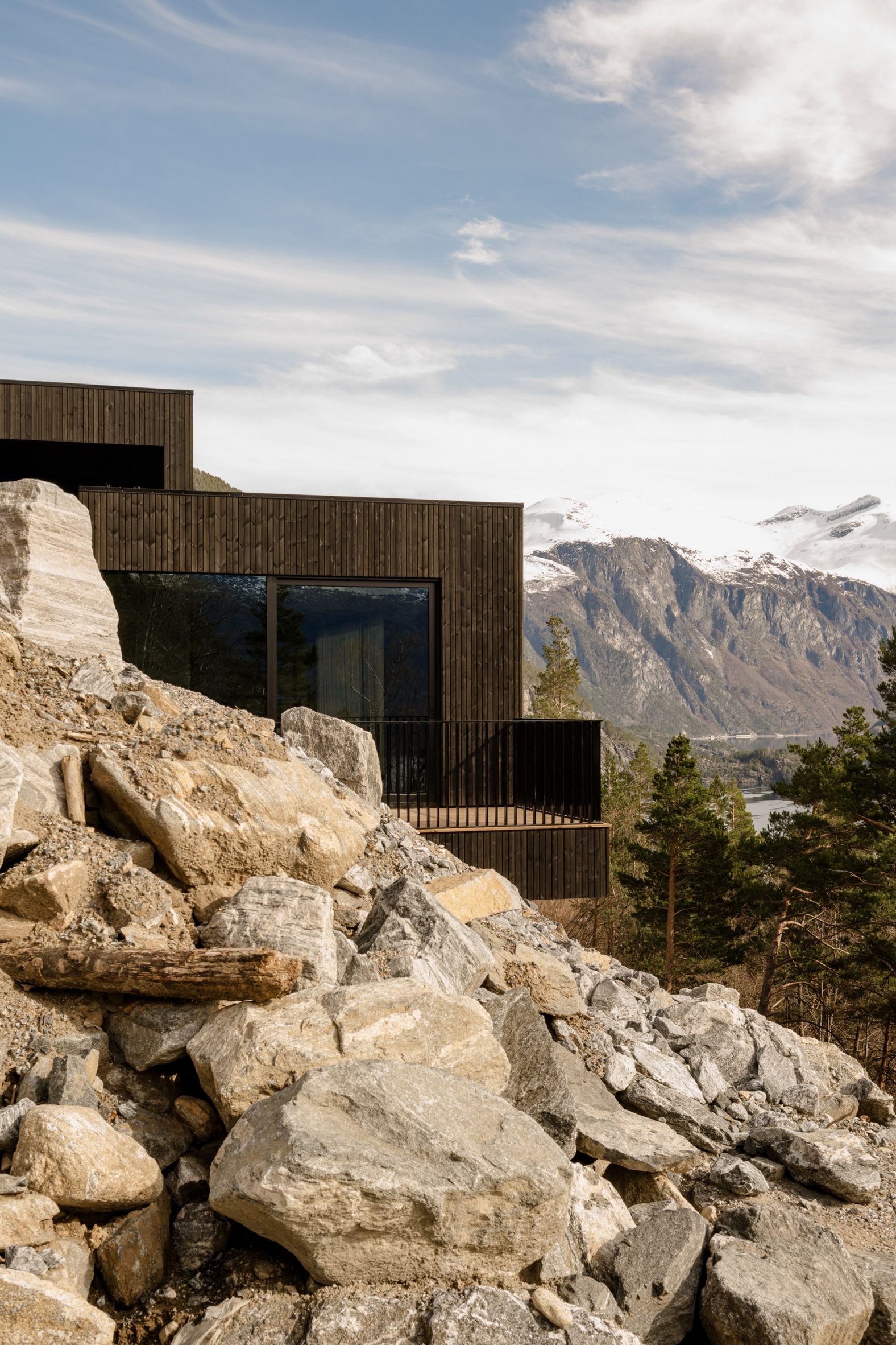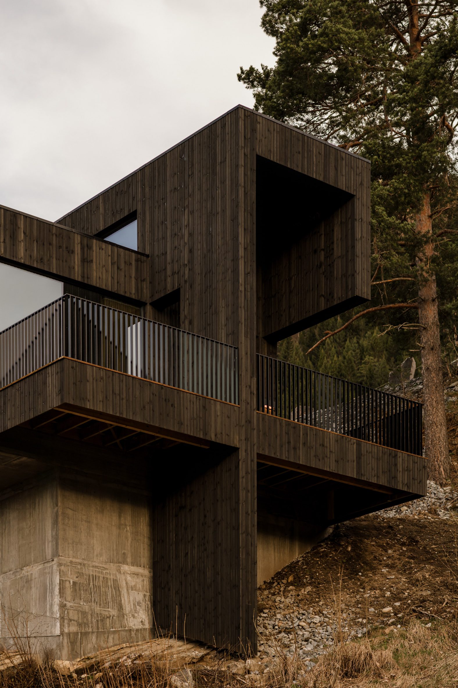 Son plan repose sur deux modules rectangulaires posés sur un socle en béton, surélevés par rapport à la pente rocheuse de la colline. Un bardage en bois noirci permet au bâtiment de s’intégrer harmonieusement aux forêts environnantes.