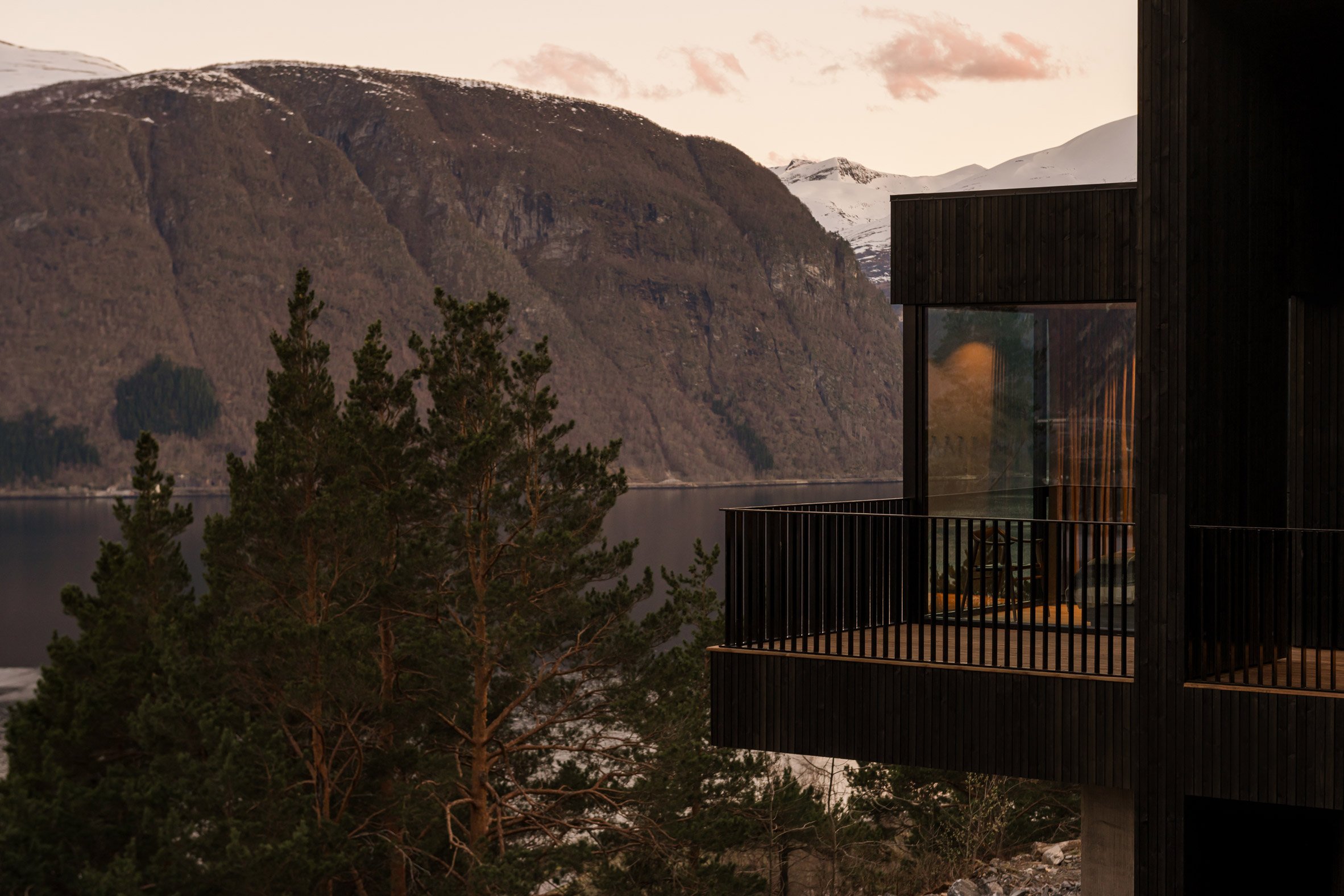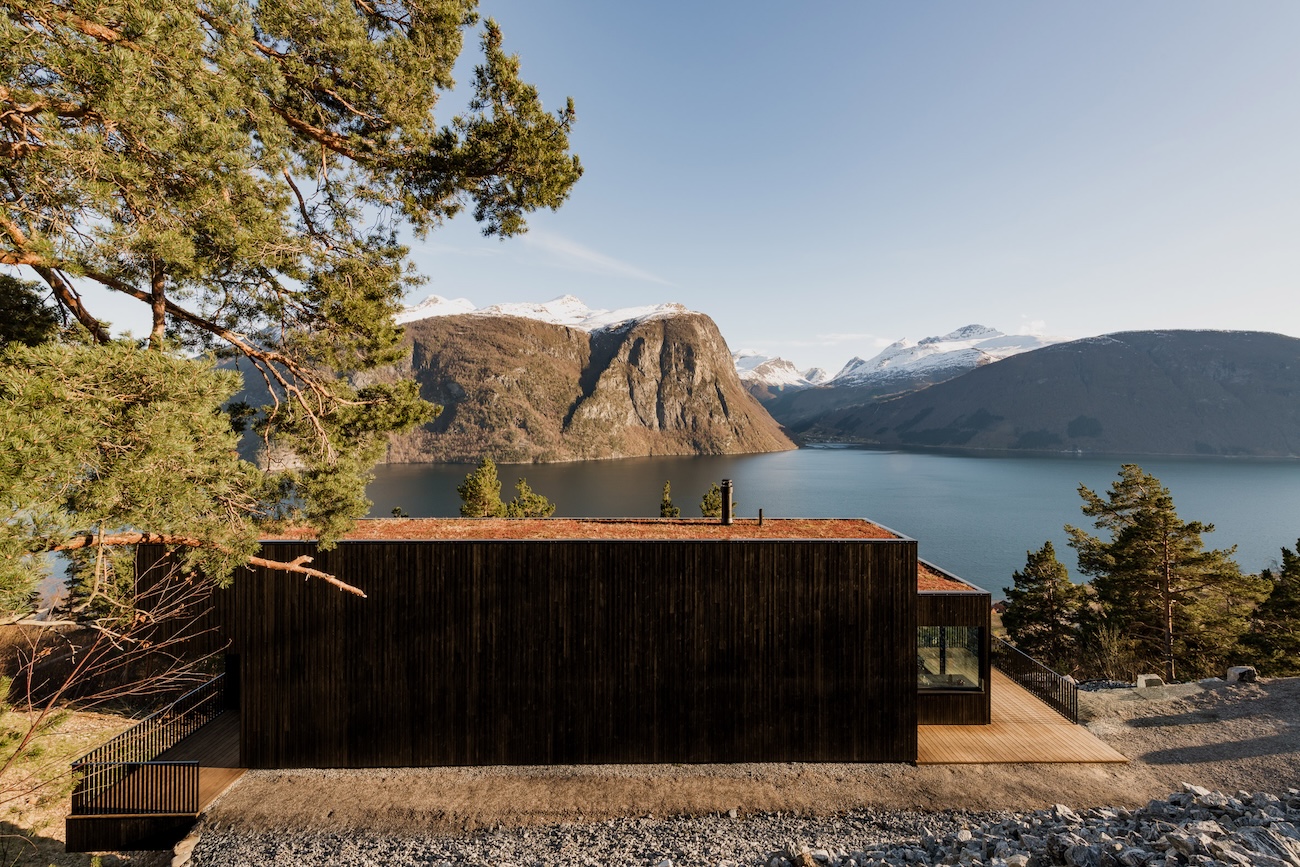 Ce dernier s’ouvre sur la maison principale, qui comprend un séjour, une cuisine, une salle à manger et des chambres. Le séjour et les chambres offrent une vue panoramique sur le fjord.