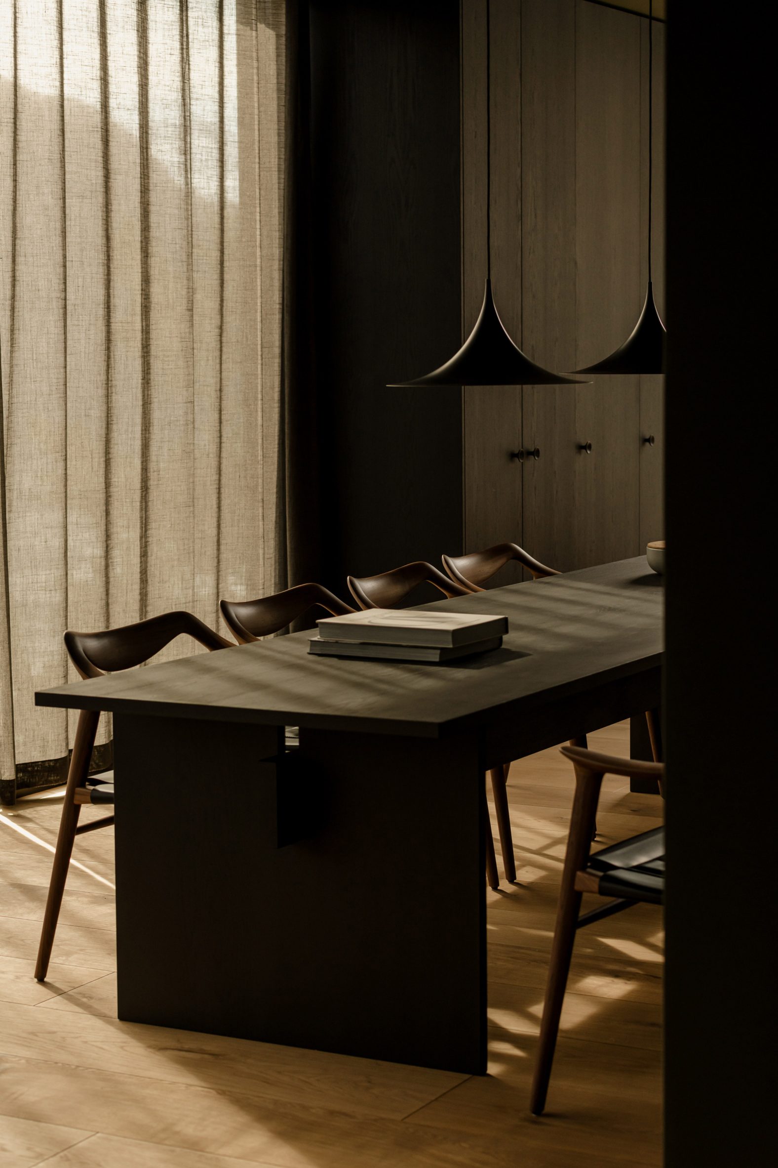 La maison de vacances intègre des meubles locaux du cabinet de design Fjordfiesta et des accessoires fabriqués par des fabricants des villages voisins. Toutes les menuiseries, portes et échelles encastrées ont été fabriquées à la main par des artisans locaux et conçues spécialement pour le projet.