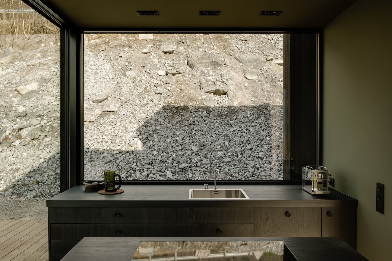 La forme horizontale fait référence à l’ardoise locale et à « les couches, ses déplacements et ses fractures » explique le fondateur du studio. La maison est perchée au-dessus d’un fjord, sur une pente rocheuse abrupte, où la construction est toujours une négociation avec le terrain.