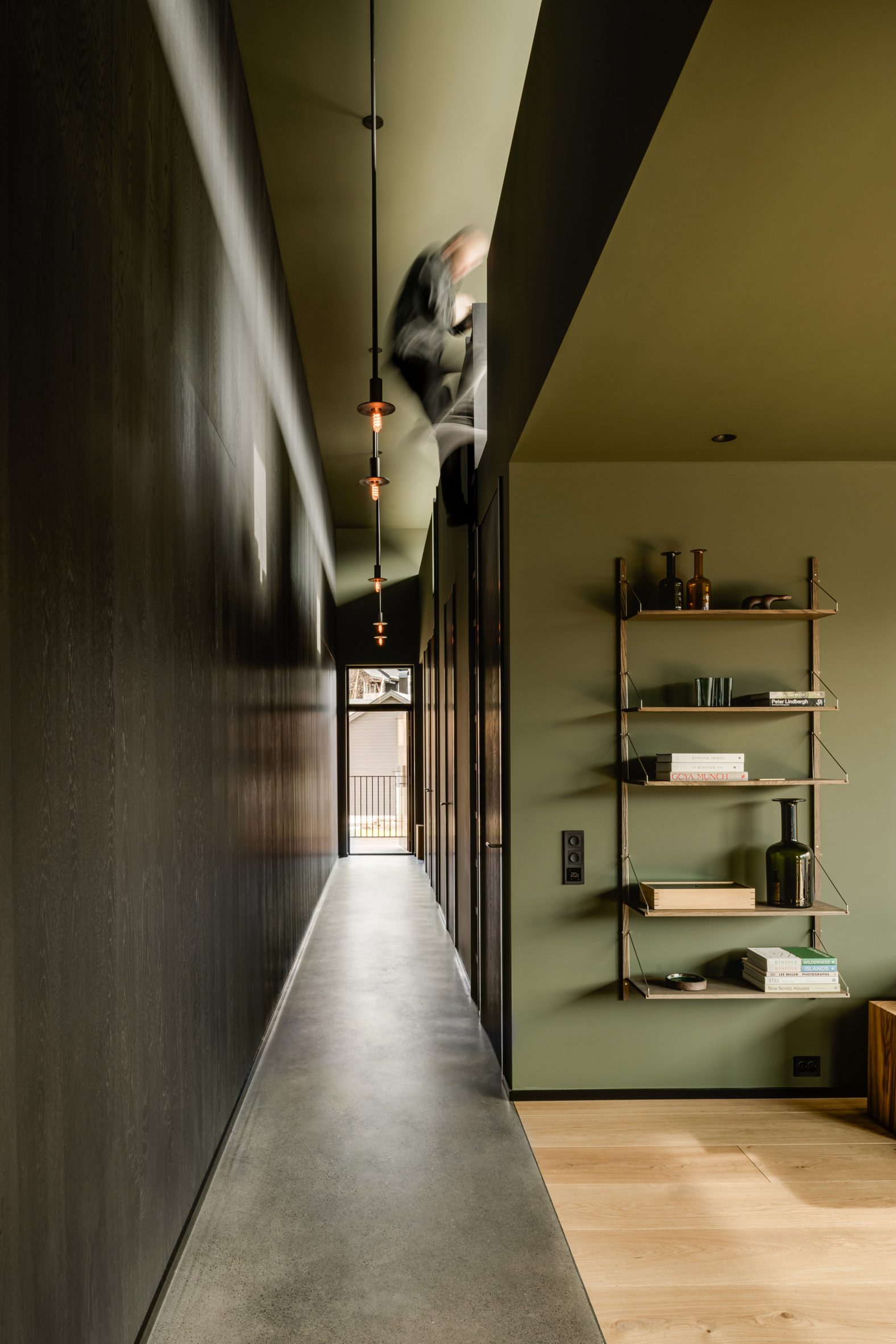À l’intérieur, Office Inainn a choisi des couleurs et des matériaux en harmonie avec l’environnement, avec des murs vert forêt et des planchers en bois.